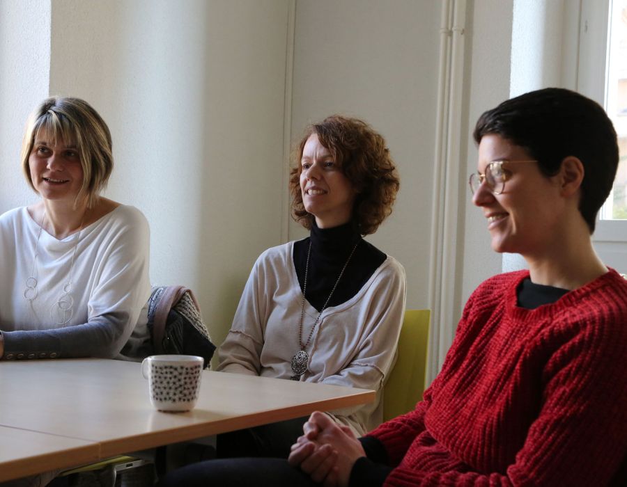 Sylvie Dupraz, Sandrine Rollinet et Cinzia Sigg assises autour d'une table.