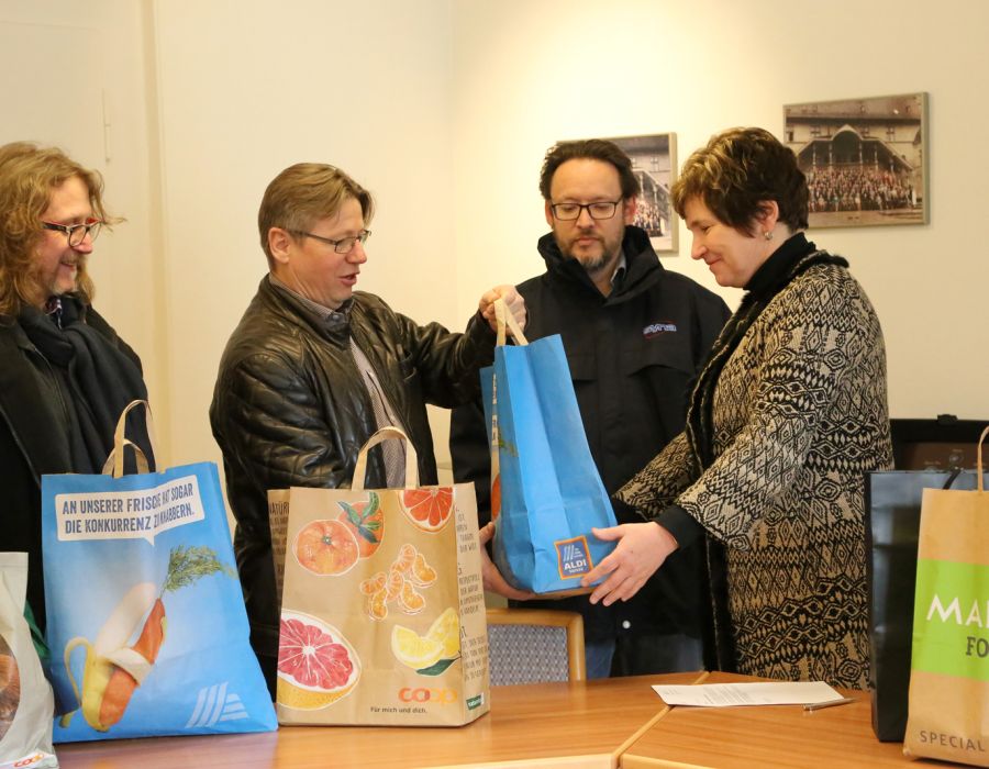Une remise de signatures peu commune… Le 31 janvier, le comité fribourgeois «contre les 17h le samedi» a déposé à la Chancellerie fribourgeoise son référendum dans des cabas des magasins de la place.