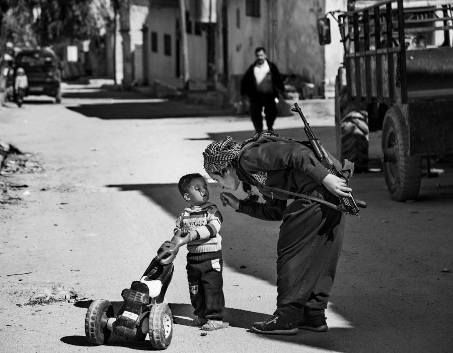 Photo de l'exposition avec une combattante kurde et un enfant.