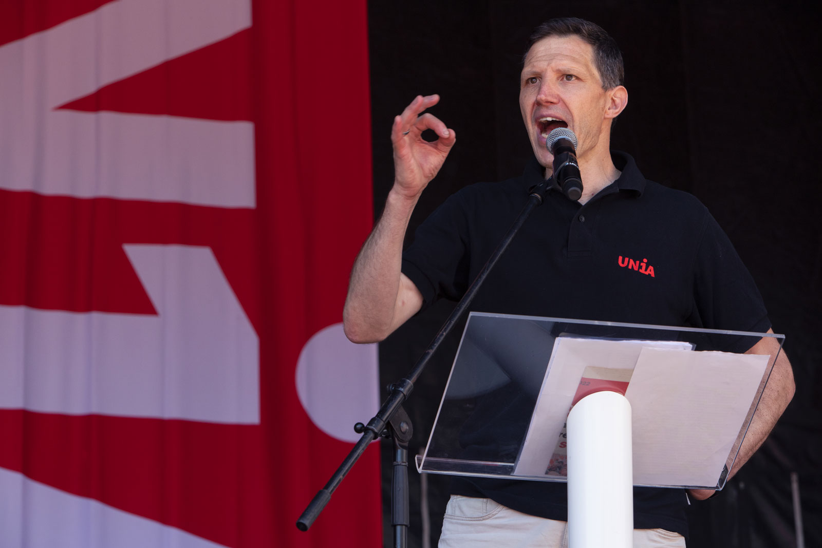 «Nous allons lutter pour notre Convention nationale» a martelé Nico Lutz, responsable du secteur de la construction d’Unia. © François Graf/Strates