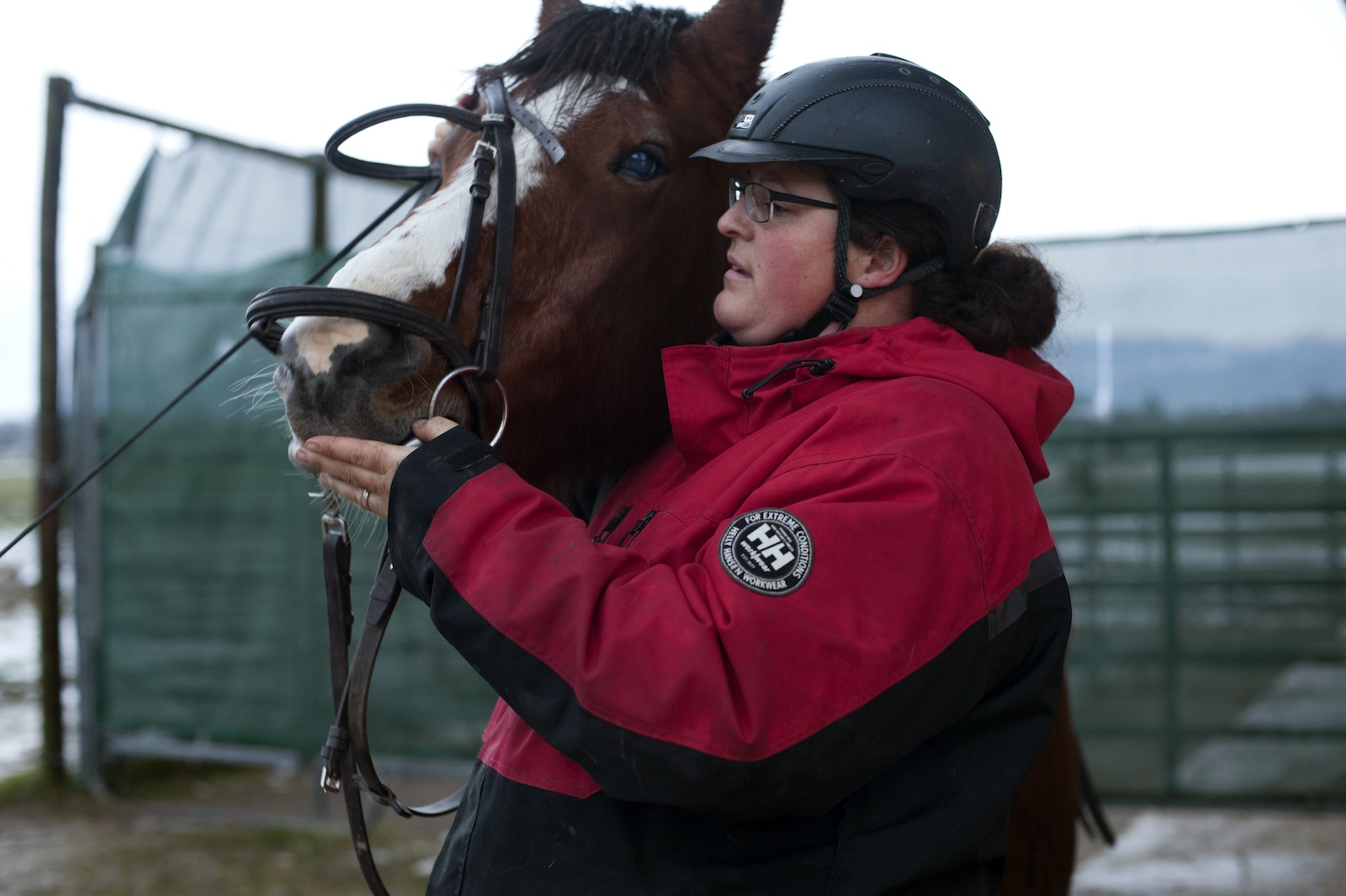 En ce mois de janvier, sur une route de Luins (VD), Myriam Dutruy avance, perchée sur son monumental cheval et coiffée d’un chapeau de Mère Noël. Pour donner le sourire aux gens, dit-elle. Myriam est hors normes, c’est ce que je vais découvrir durant les dix jours que je m’apprête à passer avec elle. Sur les papiers administratifs, par exemple, se trouve rarement la case qui correspond à son schéma familial de cinq enfants. Elle sait aussi que son gabarit n’est pas banal. Cent kilos et 1,83 mètre. Elle dit souvent que les différences, la diversité, c’est précieux.