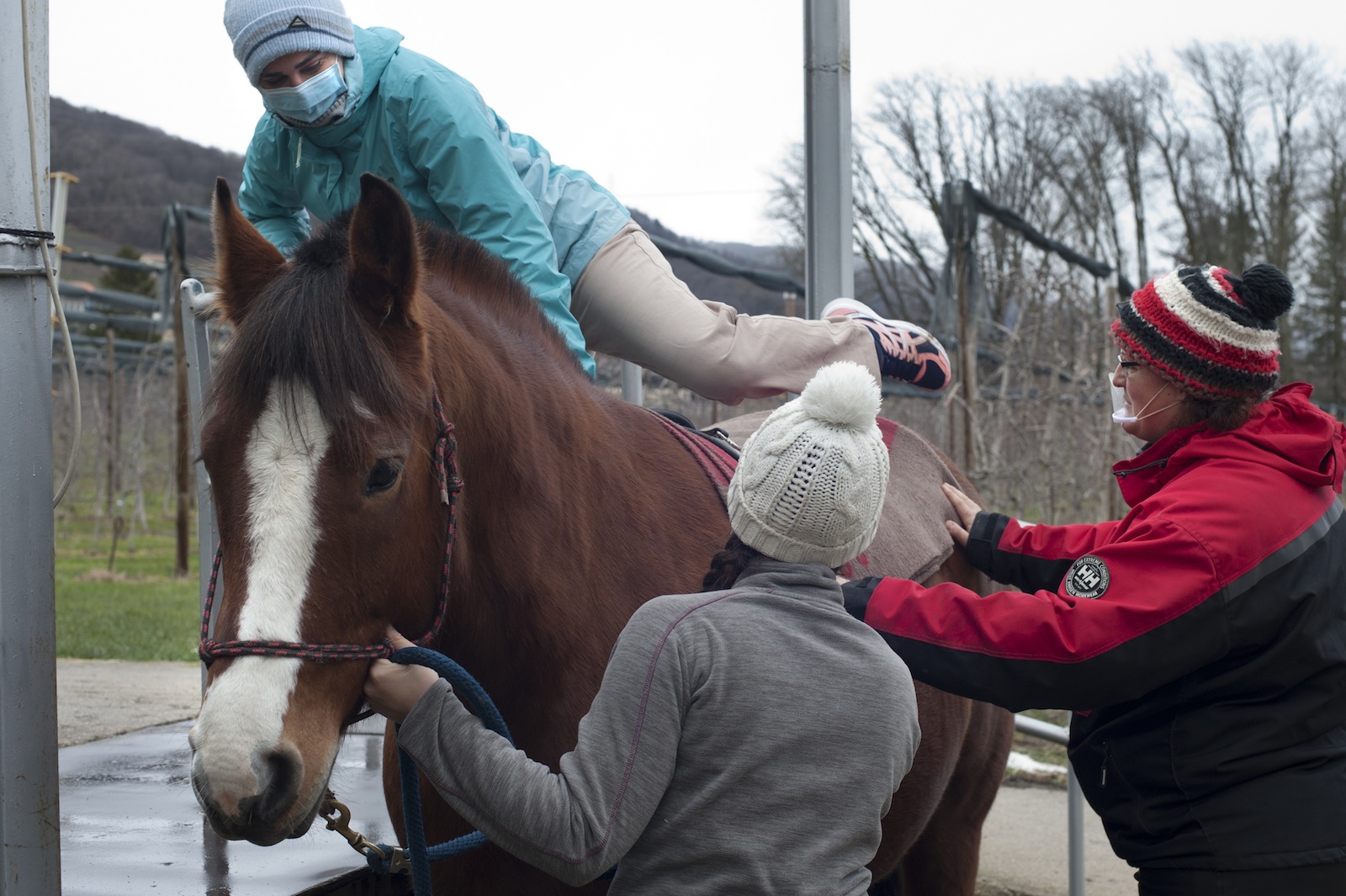 Une patiente monte sur le cheval avec l'aide des soignantes.