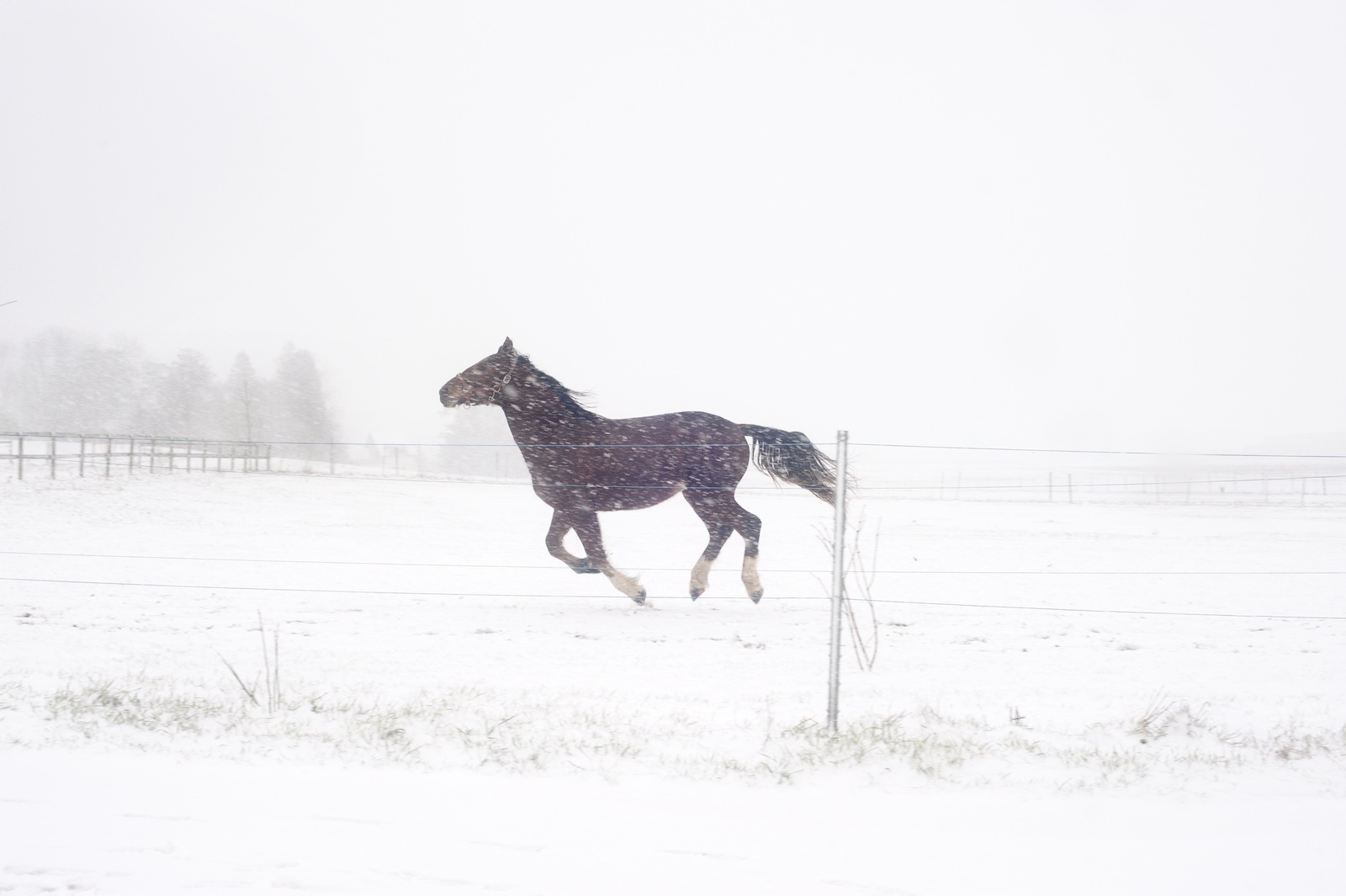 La neige qui tombe excite les chevaux qui parcourent au galop l’espace de leur enclos. © Alexis Voelin