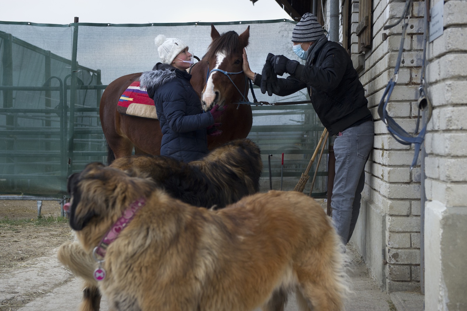 Revenons au centre d’hippothérapie-K. C’est mercredi, on déneige le sol. Accompagné par un ami, arrive Daniele, qui se déplace en fauteuil roulant. Il s’installe à la table de jardin devant la sellerie et fume une cigarette en compagnie de Serge, le patient de la séance précédente. Noémie et Myriam servent boissons chaudes, jus de pomme, biscuits. Pour Myriam, cette convivialité est essentielle pour que les patients se sentent moins seuls. Il est temps maintenant pour Daniele de partir en thérapie. Myriam l’aide à monter à cheval depuis la rampe. Pendant ce temps, tout près, son ami s’amuse. Ce précieux copain, qui le conduit chaque semaine à sa séance, est en train de lancer des boules de neige aux chiens. Je vois dans cette scène l’illustration de l’état d’esprit de Myriam: lutter contre l’abattement, chercher la joie même quand c’est difficile. Myriam a cette force, et le talent de la transmettre.