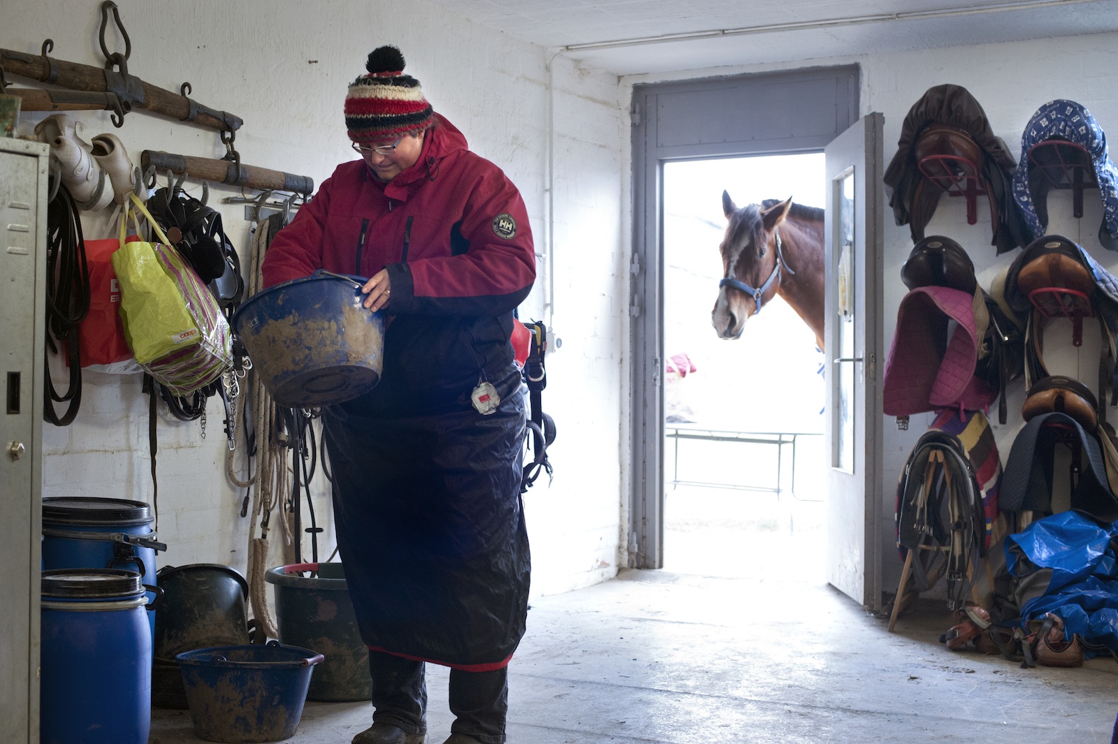 Fin de matinée: après l’entraînement d’attelage, Myriam prépare un mélange qui sera le repas d’Helena. © Alexis Voelin