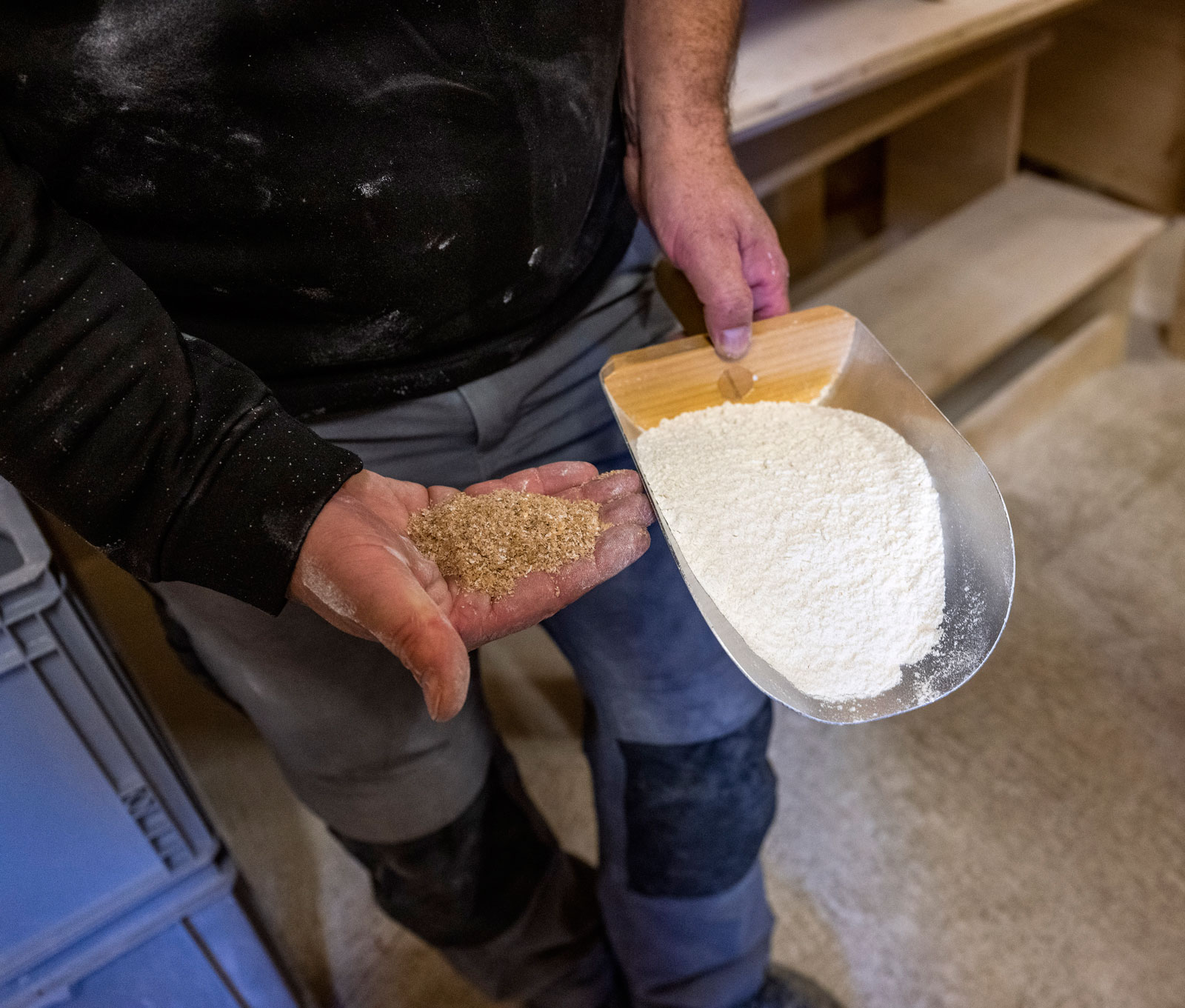 Stockés à Etagnières chez Granabio, les grains sont séchés et triés une première fois. Puis au moulin, avant la mouture, un tambour les brosse et les dépoussière. Ils sont ensuite humidifiés et moulus en traversant les stries des meules dont l’écart est savamment contrôlé. Toutes les substances sont mélangées, y compris le germe. Puis la bluterie, un tamis rotatif, sépare le son de la farine. Plus la maille est grande, plus la farine sera complète.