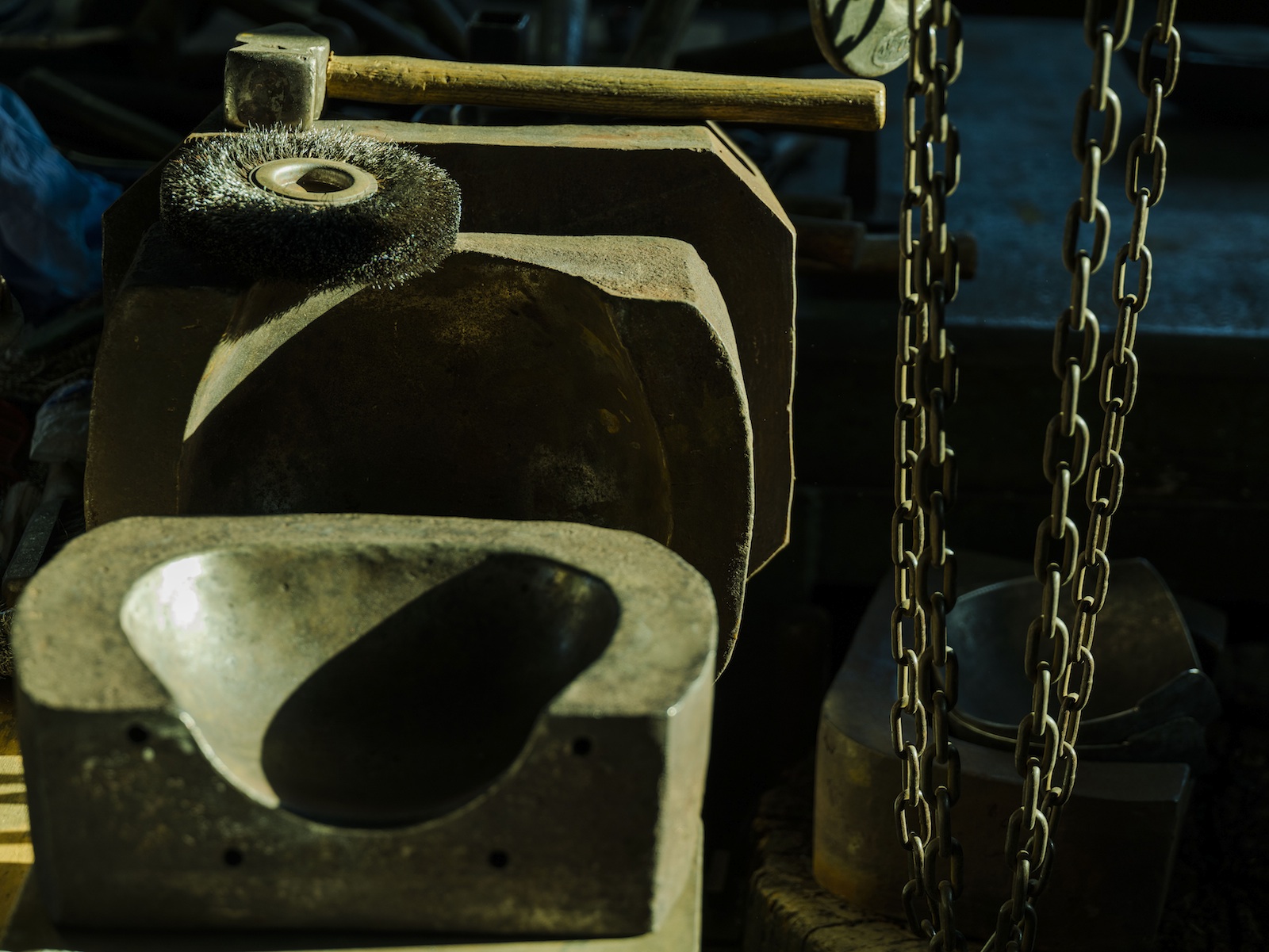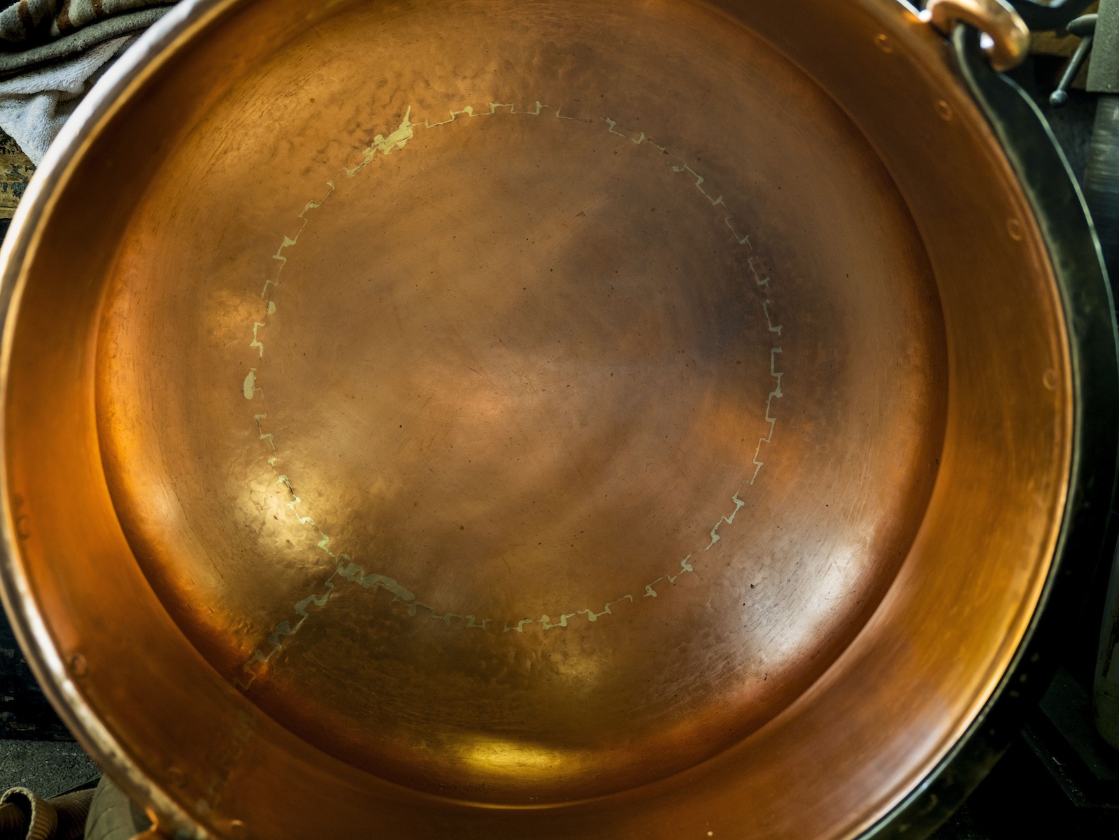 A cette époque, Pierre Turrian réalise des chaudrons d’une capacité allant d’une quinzaine de litres à 900. Les plus gros ne pèsent pas moins de 150 kilos et nécessitent quinze jours de travail. Les prix varient en fonction de la taille, oscillant entre quelques centaines de francs à plusieurs milliers. Si le processus de fabrication se résume à quelques étapes, il nécessite néanmoins un réel savoir-faire. «Les qualités requises? Faire montre d’une tronche de cochon pour marteler de la sorte, sept à huit heures par jour, plaisante l’artisan avant de poursuivre, plus sérieusement: «Il faut avoir l’œil pour les proportions et l’élégance mais aussi de la logique, bénéficier d’une bonne condition physique et d’une volonté de fer.» Concrètement, en bref, l’artisan choisit d’abord la feuille de cuivre dont l’épaisseur variera en fonction de la taille du chaudron. Il forme alors un cylindre rappondu «en queue d’aigle» qu’il cuit à une température oscillant entre 750 et 800 degrés avant de le laisser refroidir. Les petits chaudrons sont soumis à la chaleur des flammes, les gros chauffés au gaz. L’opération se répète huit à neuf fois, entrecoupée d’innombrables coups de marteau donnant corps au récipient. L’atelier recèle d’ailleurs toute une gamme de maillets choisis en fonction de la progression de l’ouvrage. «J’ai eu de la chance, je n’ai jamais souffert de tendinite ni de bursite. J’ai seulement dû être opéré en 1995 des tunnels carpiens», raconte le septuagénaire à la robuste stature, poigne et bras costauds encadrant un tablier de cuir. Cet ancien lutteur et entraîneur de la discipline note encore que, dans son métier, «il faut apprendre à transpirer et à souffrir». Une activité qui présente aussi l’inconvénient d’être très bruyante et salissante. «Mais il y a un plaisir immense à créer à partir d’une simple feuille plate un produit fini», temporise l’artisan.