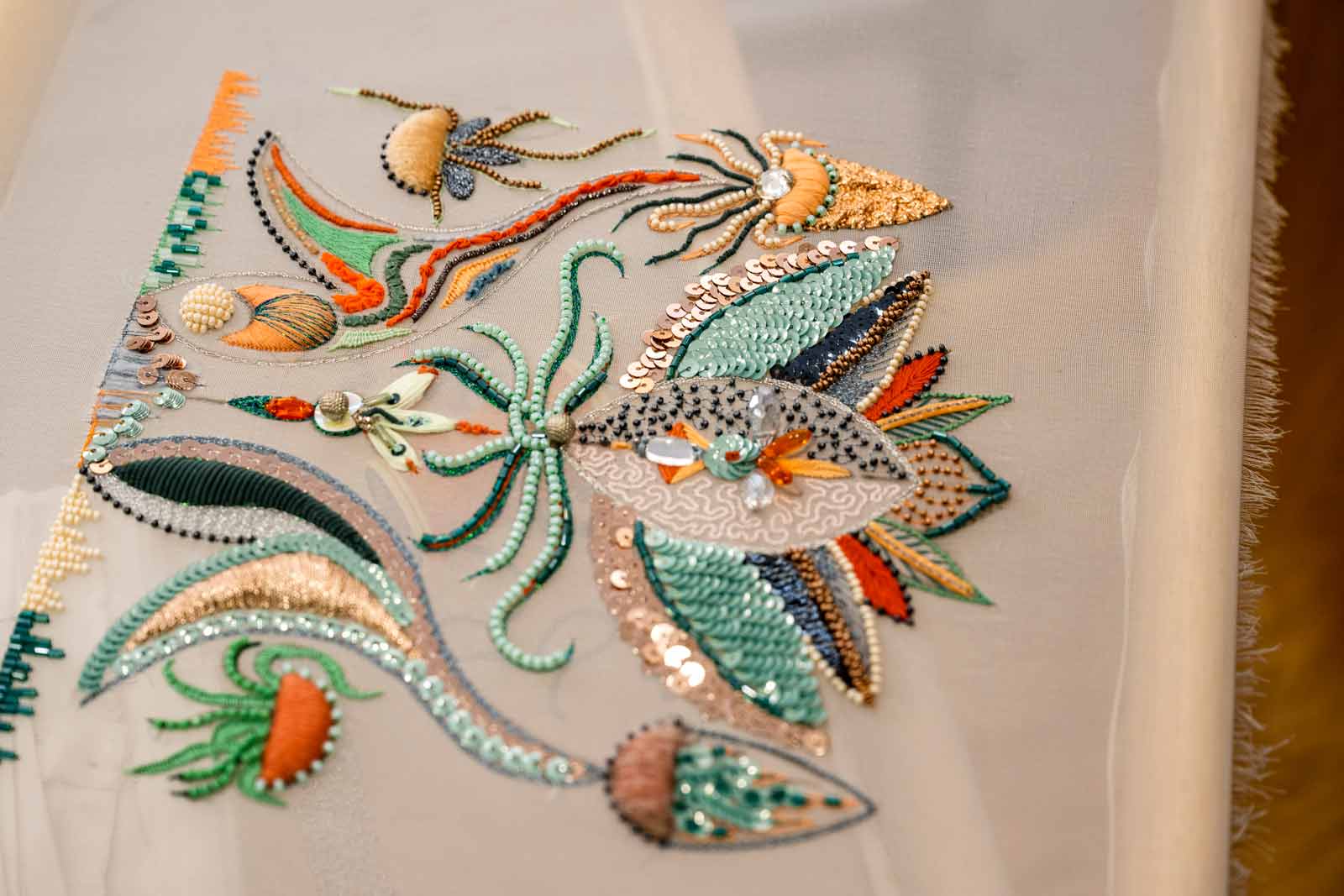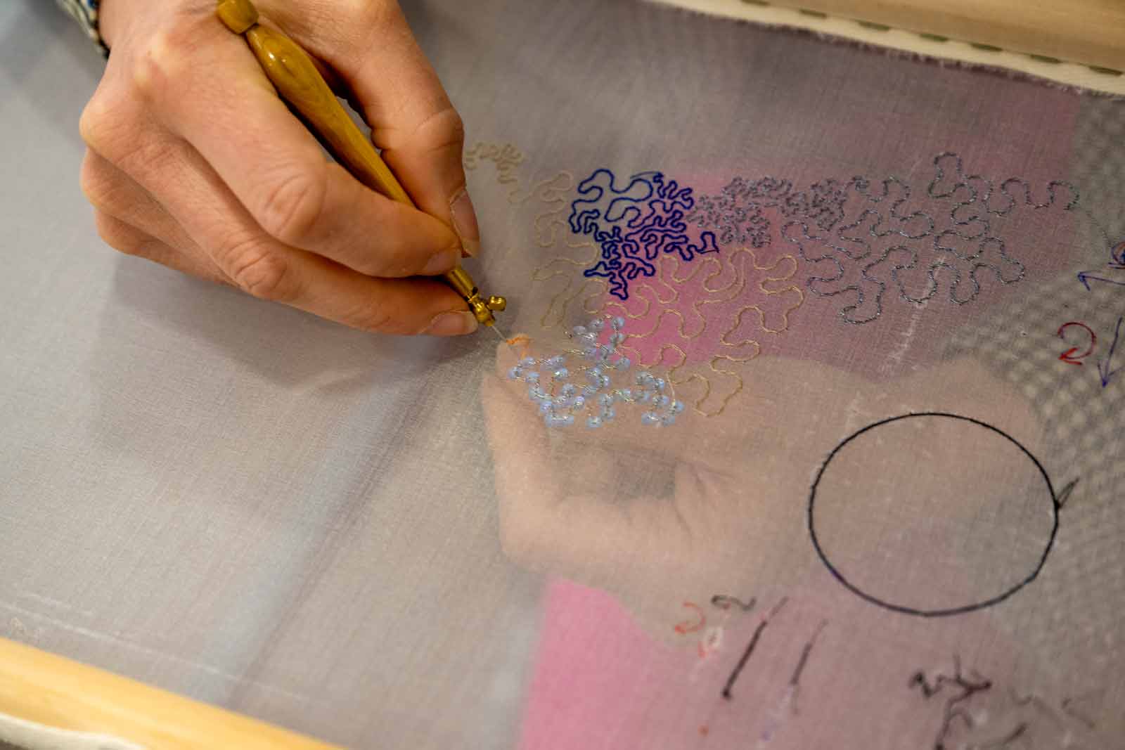 Tout en fixant chaque perle avec un point de chaînette, point par point, à l’envers – soit la perle sous la toile du métier –, Emmanuelle Perriard souligne: «En Inde, les brodeurs travaillent à l’endroit.» Et ajoute: «Là-bas, c’est un métier dit “masculin”. D’ailleurs, traditionnellement, en Europe aussi, ce sont les hommes qui brodaient, car les étoffent étaient lourdes et épaisses.»