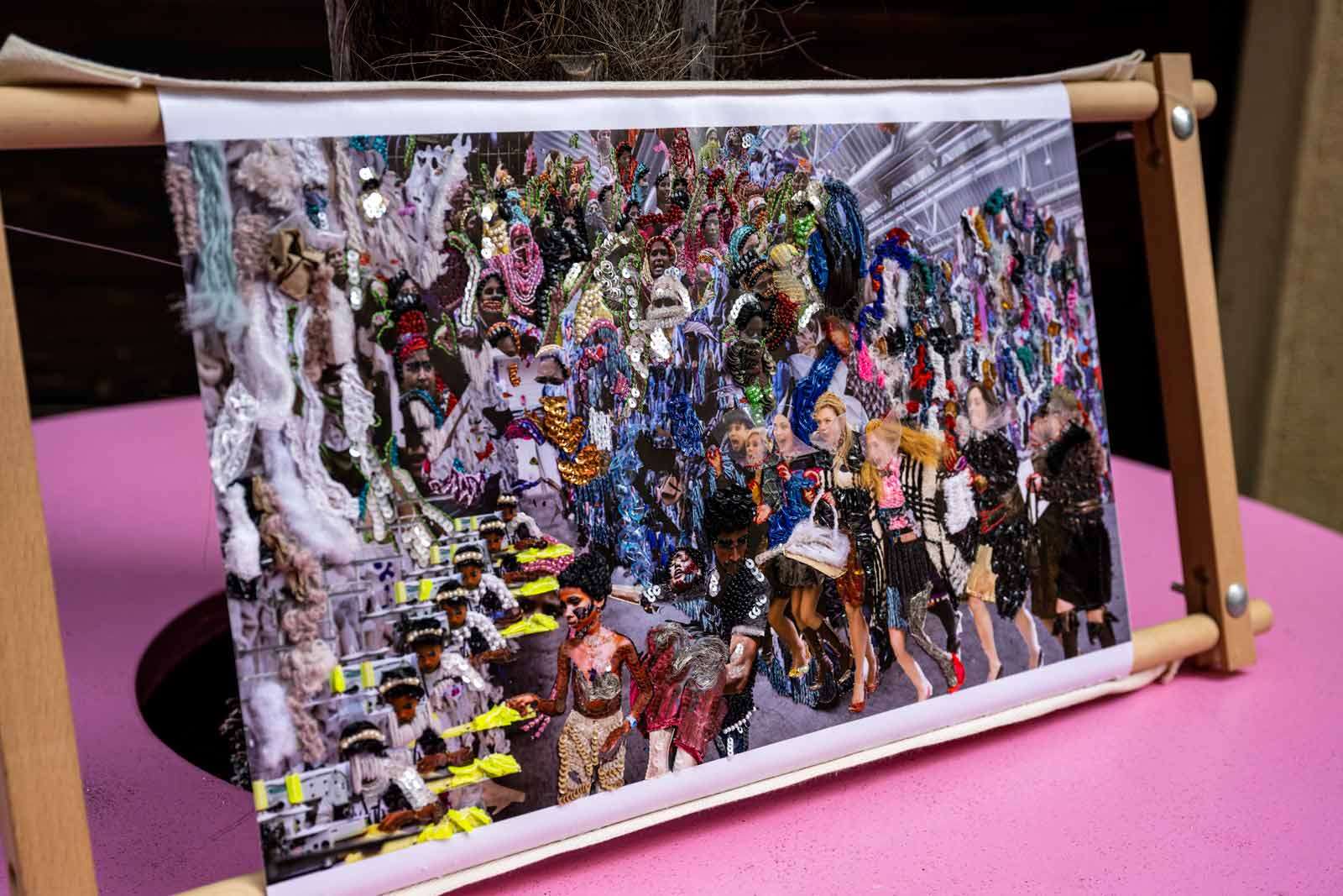 Lors de son défilé, à contre-courant, la créatrice choisit de dénoncer les masques sociaux, notre société de plastique et d’apparats, et de rappeler l’importance d’être soi-même. Mais le message ne semble pas avoir été entendu. «A la fin, sur le podium, une foule de gens sont venus prendre des selfies à mes côtés, alors que je suis une inconnue dans le domaine!» se souvient-elle encore abasourdie. Cette première expérience, enrichissante malgré tout, la motive à créer un deuxième défilé, mais d’un tout autre type. En 2023, elle l’organise au Neubourg, dans la rue de son atelier, avec un melting-pot de personnes lambda habillées de vêtements choisis en seconde main. «Elles portaient mes bijoux brodés, des sacs en plexiglas recyclés créés par Amandine et étaient coiffées par Céline. Nous étions toutes et tous bénévoles», souligne Emmanuelle Perriard.