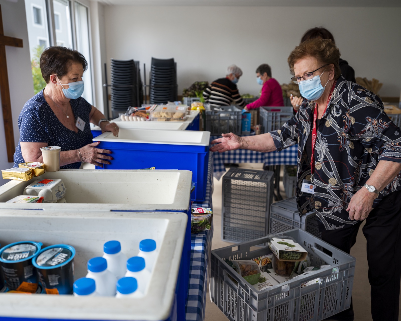 Devant la paroisse, sous un soleil généreux, une file bigarrée de personnes commence à se former, sacs à commissions ou à roulettes à la main. Les langues sont plurielles mais la pauvreté, commune. Aux indigènes se mêlent des Afghans, Syriens, Kurdes… Tous ont reçu, lors de leur dernière venue, un billet mentionnant l’heure à laquelle ils sont attendus. «En raison du Covid-19, nous devons limiter le nombre de présents dans la salle. Par souci d’équité, nous faisons un tournus dans les heures, le choix de provisions étant plus large à l’ouverture de la Table», explique Catherine Gnaegi, précisant encore que les gens ne peuvent pas se servir seuls pour des raisons d’hygiène. Nicole, une bénévole de 79 ans, gère les entrées où trône l’incontournable gel hydroalcoolique. Masquée et protégée par un panneau en plexiglas, elle vérifie la carte délivrée par l’aide sociale que les bénéficiaires sont tenus de présenter. «Ils doivent aussi s’acquitter d’un franc symbolique», souligne cette ancienne enseignante, ajoutant avoir fait du bénévolat toute sa vie. «Je ne peux pas trop porter de marchandises car j’ai mal à l’épaule, mais je ressens le besoin de venir ici. C’est aussi un moyen de me sortir du quotidien. Mon mari souffre du cœur. Quand je ne peux pas participer à la Table, cela me manque.»