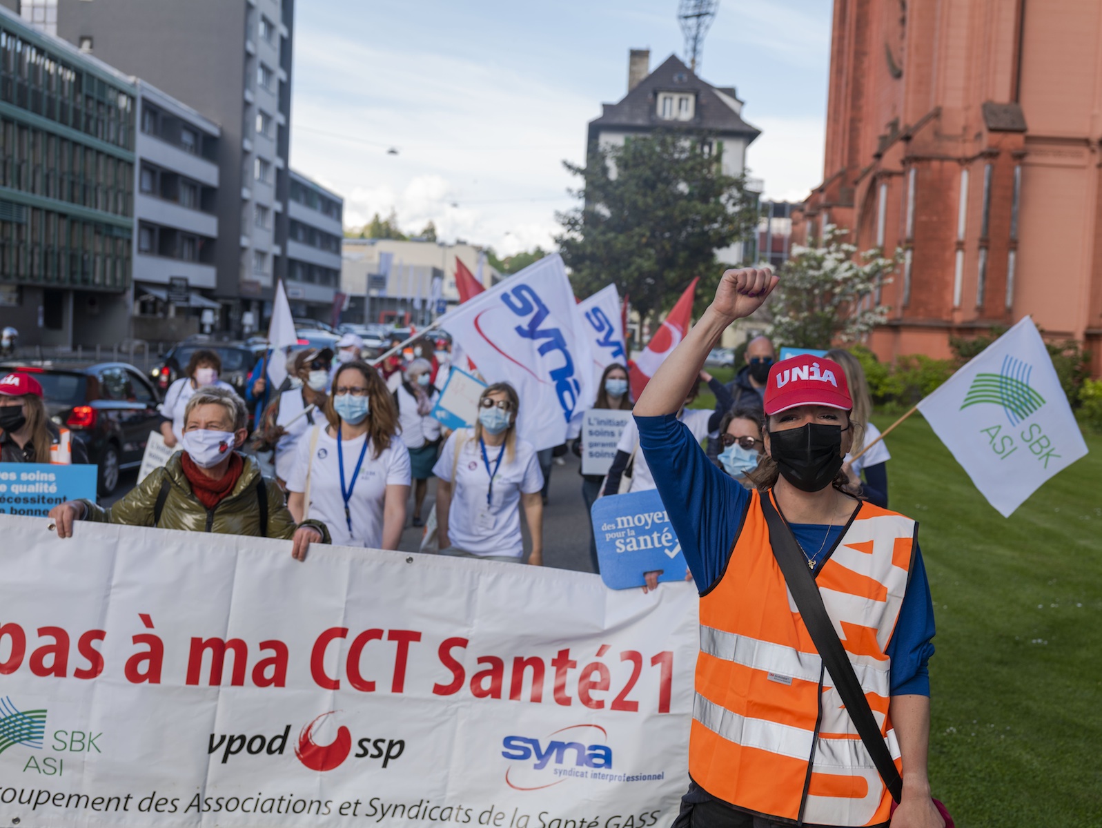 Le Tribunal administratif fédéral promeut la concurrence entre les établissements de santé publics et privés, en autorisant que les dispositions des conventions collectives de travail soient édulcorées. Il piétine ainsi les droits du personnel et de ses syndicats en lutte, comme ici à Neuchâtel en mai dernier, pour défendre les conditions de travail des soignants.