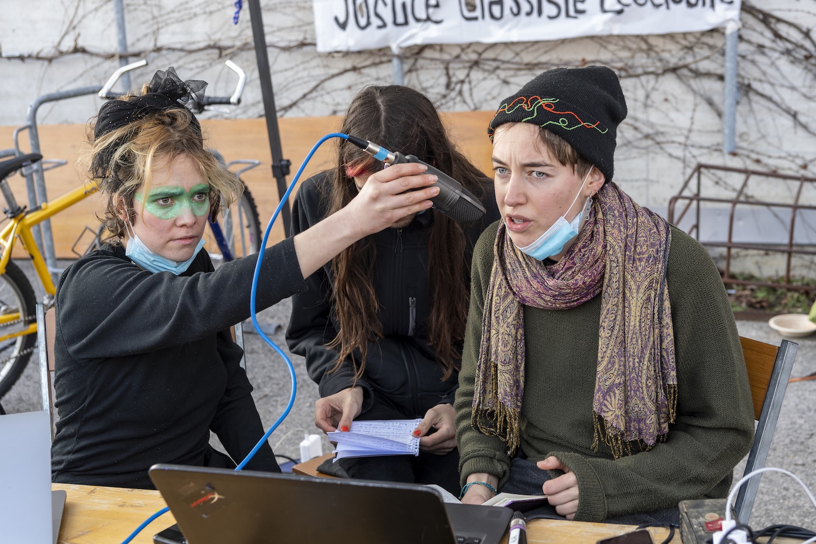 Lundi 17 janvier, il y a comme un petit air de Zad à Nyon. Juste derrière la gare, la musique retentit et les odeurs de nourriture et de café titillent les papilles. Des jeunes jonglent, expérimentent des jeux en bois, discutent. Au milieu passent les voitures, tranquillement. Aucune remarque ne fuse de la part des militants écologiques. La tolérance est d’or. Zadio Rad, la radio qui avait commenté avec un humour piquant l’évacuation de la Zad du Mormont le 30 mars 2021 retransmet ses enregistrements et donnent la parole aux personnes présentes.