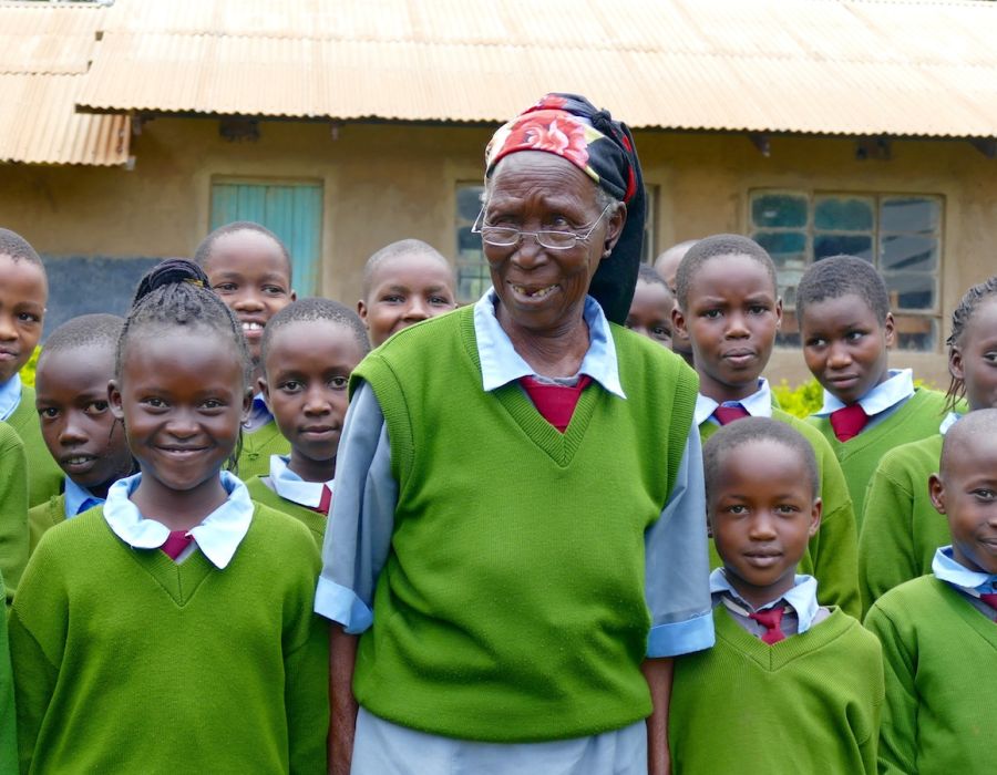 Image tirée du film Gogo. Une vieille femme entourée d'enfants. Tous portent un uniforme d'écolier vert tilleul.