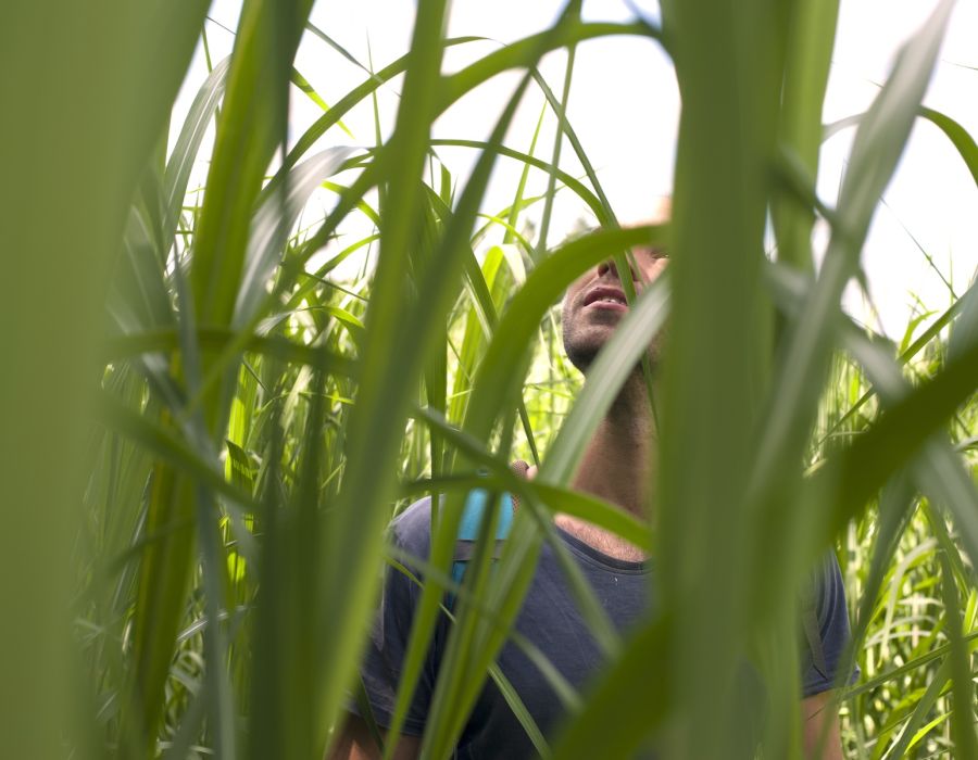 Nicolas Marty pose appuyé sur un échafaudage