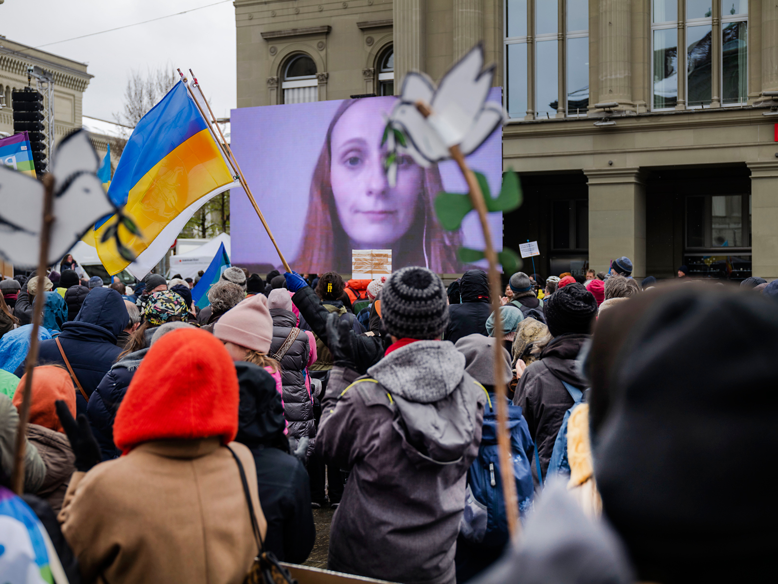 Parti de la Schützenmatte, le cortège s’est déployé à travers la vieille ville pour finir devant le Palais fédéral, laissant place aux discours. Un moment émouvant lors duquel est intervenue depuis Lviv en visioconférence Olesia Briazgunova, secrétaire internationale de la Confédération des syndicats libres d’Ukraine (lire ci-dessous). Ekaterina Glikman, opposante démocratique russe et collaboratrice de la Novaya Gazeta, journal russe indépendant qui vient d’annoncer la suspension de ses publications, et Hannah Perekhoda, Ukrainienne vivant en Suisse, ont également pris la parole. La directrice d’Amnesty International Suisse, Alexandra Karle, et la présidente de l’Église évangélique réformée, Rita Famos, sont aussi intervenues. Une minute de silence à la mémoire des victimes de cette guerre a clôturé les prises de parole.