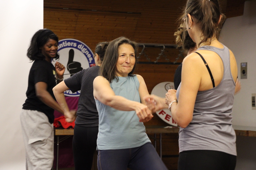 Après un petit échauffement, les femmes se mettent par groupes de deux et expérimentent des exercices visant à recentrer les énergies, puis à renforcer la confiance en soi. «Il faut être solide à l’intérieur!» rappelle Erin.