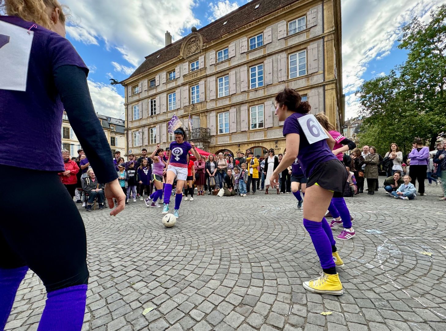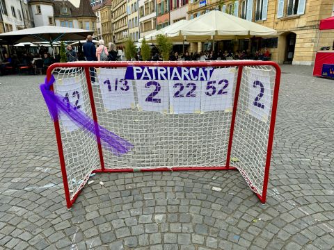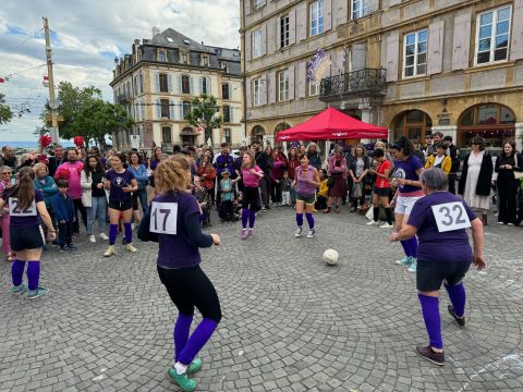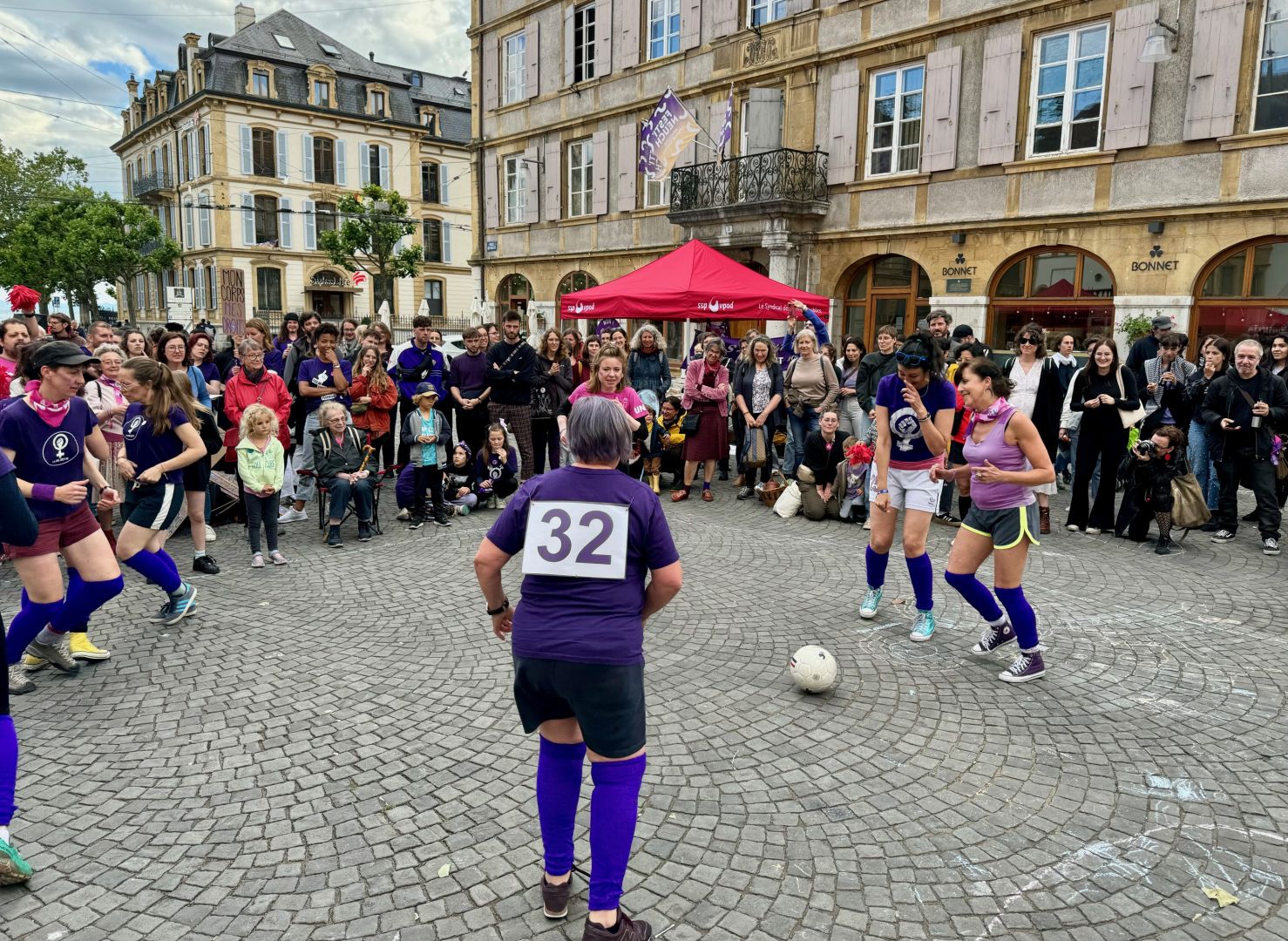 Hasard du calendrier, la grève féministe a eu lieu cette année le même jour que le lancement de l’Euro en Allemagne. Du coup, les militantes neuchâteloises ont saisi cette occasion pour donner un spectacle humoristique et revendicatif en forme de match de foot sur la place des Halles. Les joueuses de l’équipe féministe doivent essayer d’envoyer le ballon dans les goals du patriarcat, «qui a une certaine avance au championnat du monde, mais aussi au championnat suisse», annonce celle qui fait office de commentatrice