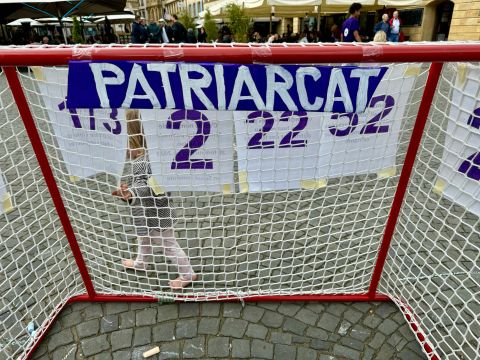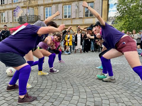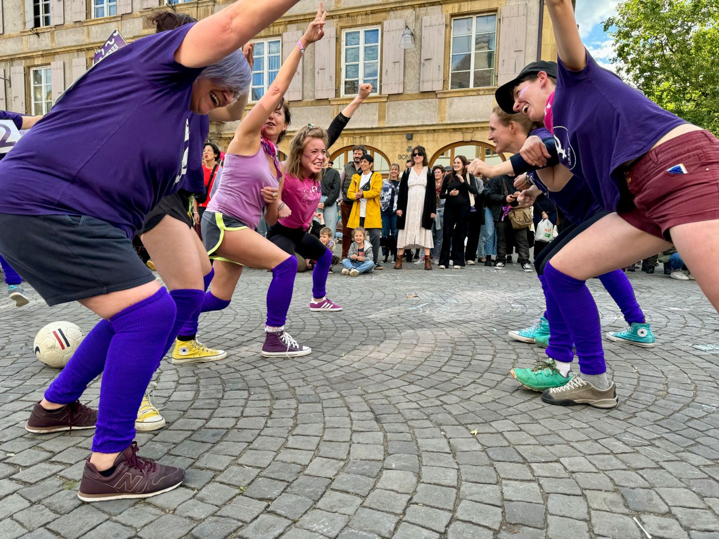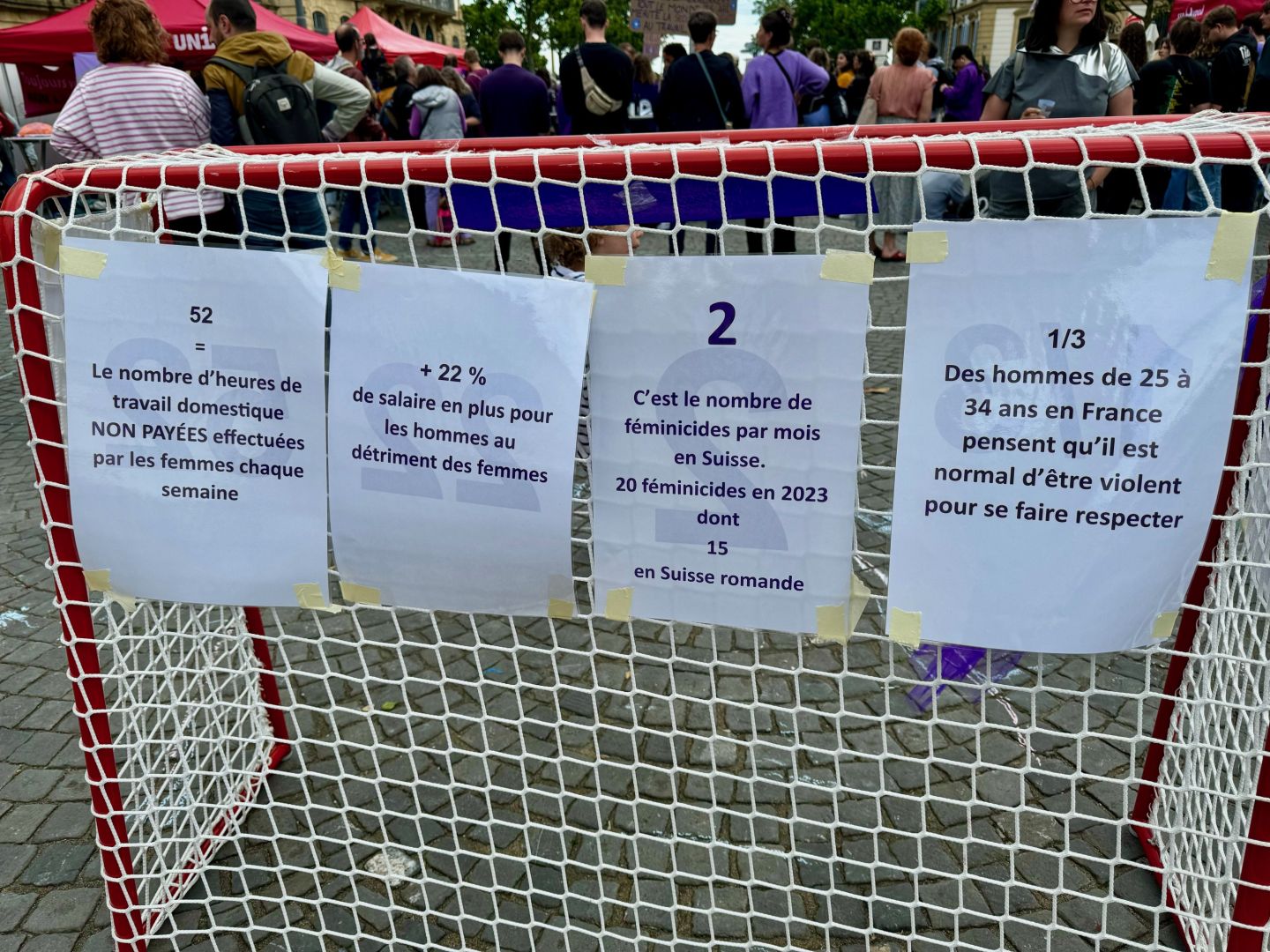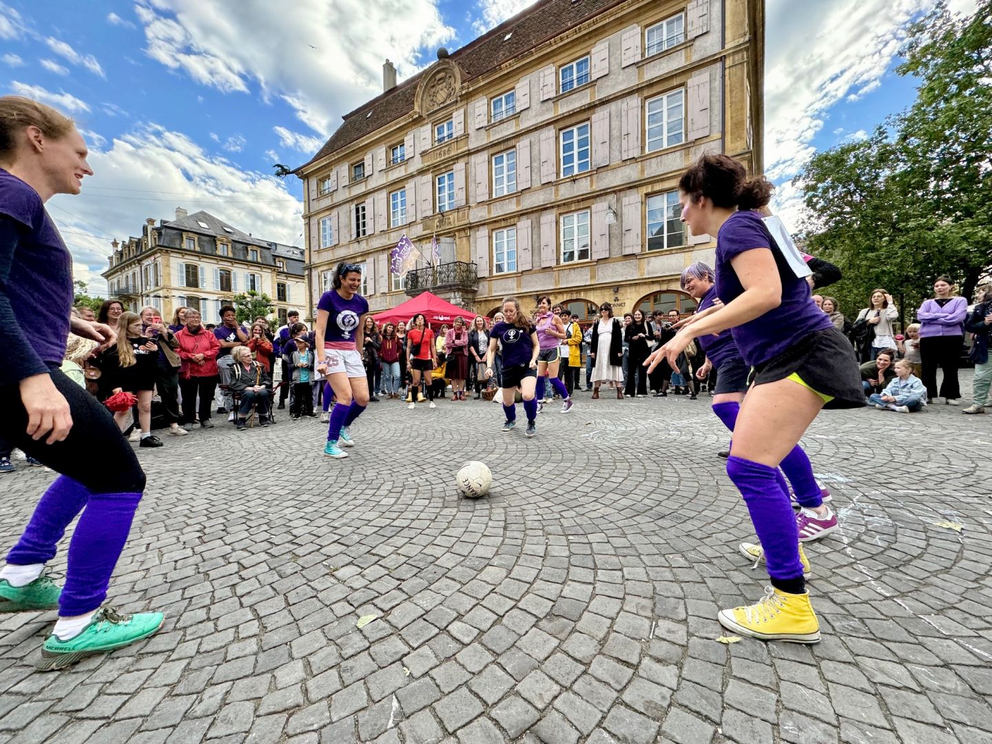 Hasard du calendrier, la grève féministe a eu lieu cette année le même jour que le lancement de l’Euro en Allemagne. Du coup, les militantes neuchâteloises ont saisi cette occasion pour donner un spectacle humoristique et revendicatif en forme de match de foot sur la place des Halles. Les joueuses de l’équipe féministe doivent essayer d’envoyer le ballon dans les goals du patriarcat, «qui a une certaine avance au championnat du monde, mais aussi au championnat suisse», annonce celle qui fait office de commentatrice