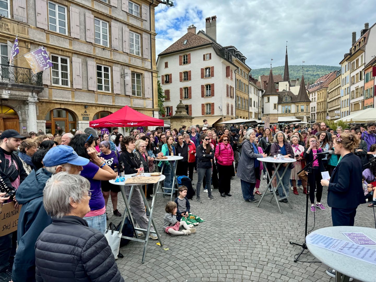 Pour Unia, cette journée de mobilisation féministe avait commencé bien plus tôt. Dès l’aube, les représentantes du syndicat ont distribué des tracts devant les entreprises d’horlogerie de la région, à l’heure où le personnel en grande partie féminin prend son travail. «Le but est d’informer les travailleuses et les travailleurs des améliorations qu’apporte la nouvelle Convention collective de l’horlogerie, notamment pour les femmes», explique Rébecca Lena, secrétaire syndicale d’Unia Transjurane. Parmi celles-ci, citons la prolongation du congé maternité à 19 semaines, la possibilité d’avoir des congés payés pour les proches aidants, l’augmentation de la participation patronale aux primes d’assurance maladie ou encore l’obligation de justifier un refus de demande de temps partiel.