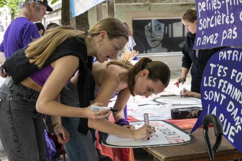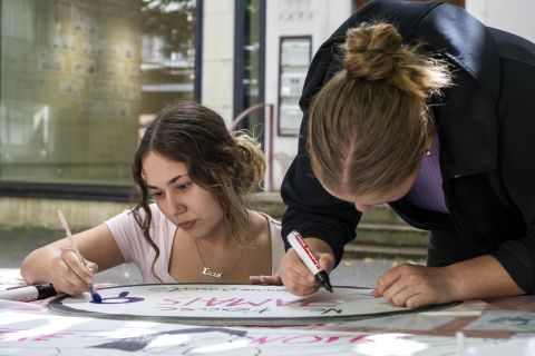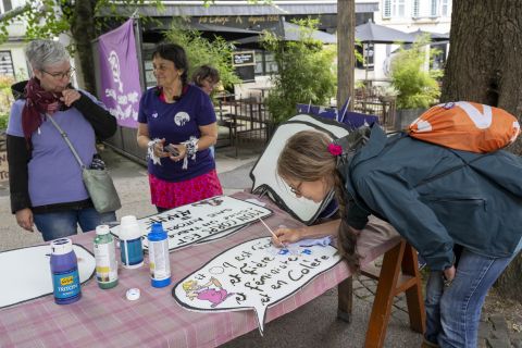Pas de manifestation sans slogans. Avant le cortège de fin de journée dans les rues de la vieille ville de Delémont, le Collectif féministe Jura a organisé en début d’après-midi du 14 juin un atelier de confection de banderoles et de pancartes sur la place Roland-Béguelin. Une manière créative et ludique de se préparer à défiler afin de revendiquer, entre autres, des mesures d'urgence pour protéger les victimes de violences et l’amélioration des conditions de travail pour le personnel soignant du canton.