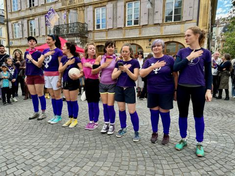 Vêtues de tenues de foot violettes, elles arborent dans le dos des numéros liés aux revendications féministes. L’une d’elles porte par exemple le 32. «C’est le pourcentage de rentes AVS perçu en moins par les femmes», explique Solenn Ochsner, secrétaire syndicale à Unia Neuchâtel et membre du collectif de la Grève féministe. Pour sa part, elle a le numéro 12, le pourcentage de rentes en moins si la réforme du 2e pilier (LPP 21) est acceptée dans les urnes en septembre.