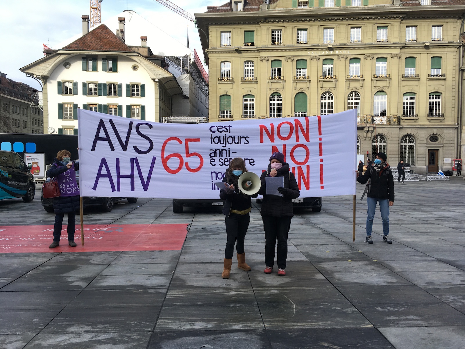 Le 14 décembre dernier, devant le Palais fédéral, des représentantes des collectifs de la Grève féministe et des femmes* ont rappelé leur opposition à l’élévation de l’âge de la retraite de 64 à 65 ans.