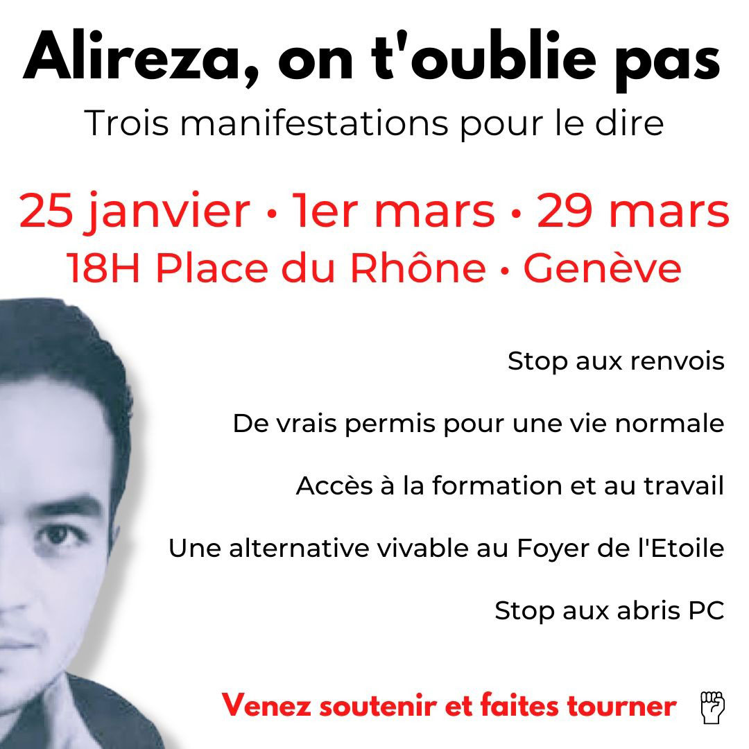 Le collectif «Alireza, on t’oublie pas», les jeunes de l’Etoile, la Coordination asile.ge, la Ligue suisse des droits de l’homme, le Silure, Solidarité Tattes, le SSP et Unia appellent à manifester ce soir, 25 janvier, à 18h à la place du Rhône à Genève pour ne pas oublier ce jeune requérant d’asile afghan qui s’est donné la mort au Foyer de l’Etoile après avoir reçu son avis d’expulsion. Comme le souligne l’association citoyenne Solidarité Tattes dans sa démarche: «Se souvenir d’Alireza, ce n’est pas seulement pleurer, c’est aussi lutter. Et la lutte est plus que nécessaire, alors qu’on vient d’apprendre un nouveau décès, celui de Tony, résident au Foyer du Lagnon.» Le collectif rappelle que les cantons ont une marge de manœuvre concernant les renvois. Elle demande donc leur arrêt, mais aussi la prise en compte des certificats médicaux, de «vrais permis pour une vie normale», un accès à la formation et au travail, des logements dignes. D’autres rassemblements sont déjà prévus le 1er et le 29 mars.