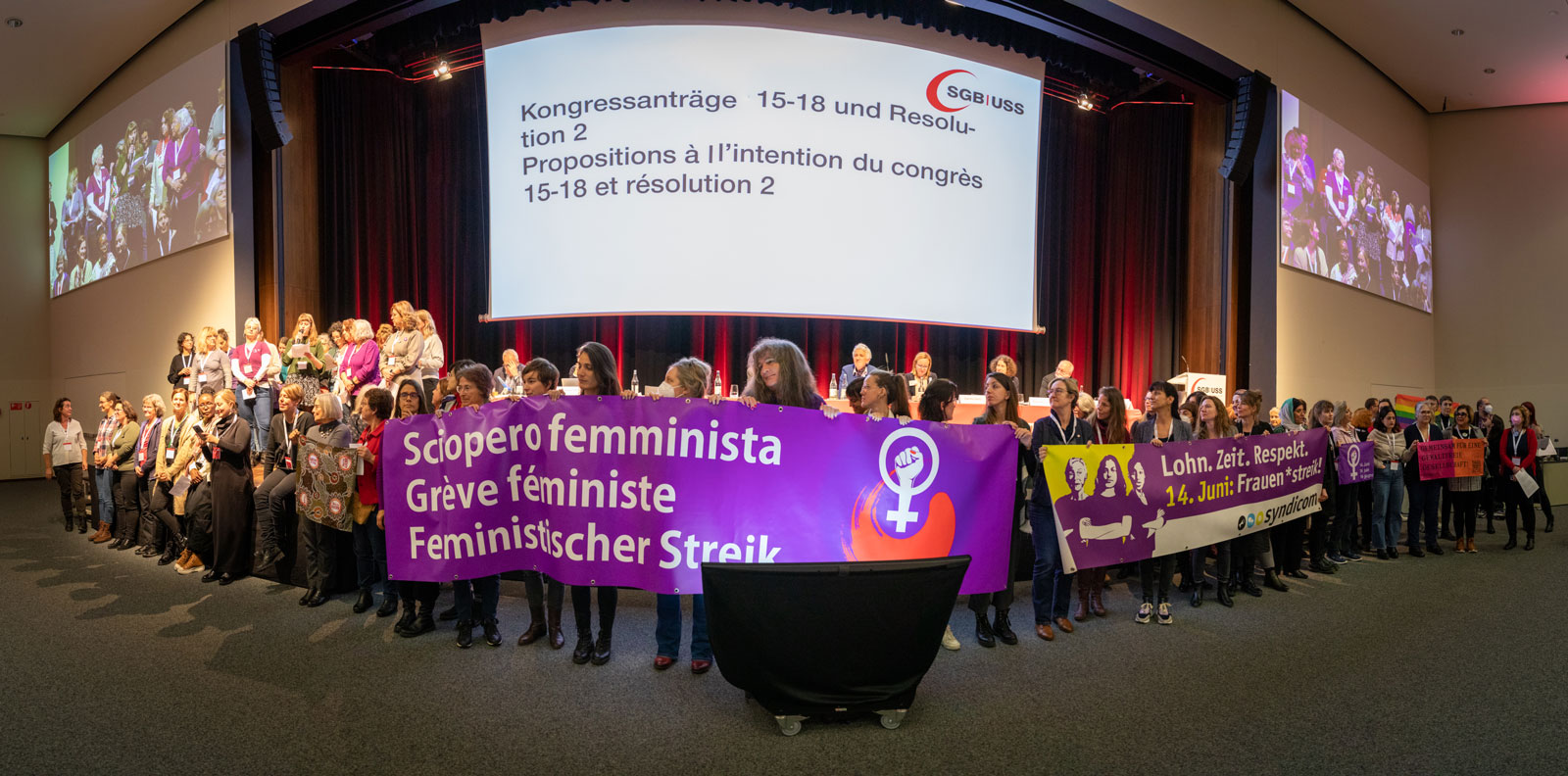 Le congrès s’est ensuite tourné vers la grève féministe. Une douzaine de femmes sont montées à la tribune pour soutenir une résolution et plusieurs propositions en faveur de l’organisation d’une nouvelle grève le 14 juin 2023. Elles ont été rejointes devant la scène par la plupart des déléguées présentes. «Nous avons impulsé la grève de 2019 lors du congrès des femmes de l’USS il y a cinq ans. Cela a été une mobilisation historique, la plus grande de l’histoire suisse depuis la grève générale de 1918. La grève féministe va au-delà des idées de grève du travail. Nous, les féministes, avons réinventé cette lutte. Il est temps de prendre au sérieux les revendications des femmes travailleuses. Nos syndicats doivent sortir de la logique de paix du travail», ont scandé les militantes. Une déléguée tessinoise d’Unia a rappelé que les revendications de 2019 n’ont pas été réalisées: «Nous devons préparer notre mobilisation sur les lieux de travail, avec nos syndicats. Nous devons être plus organisées, plus visibles. Toutes les femmes, tous les hommes doivent participer. Ce n’est pas seulement une affaire de femmes. Nous devons agir de manière transversale pour que cette grève soit un succès.»
