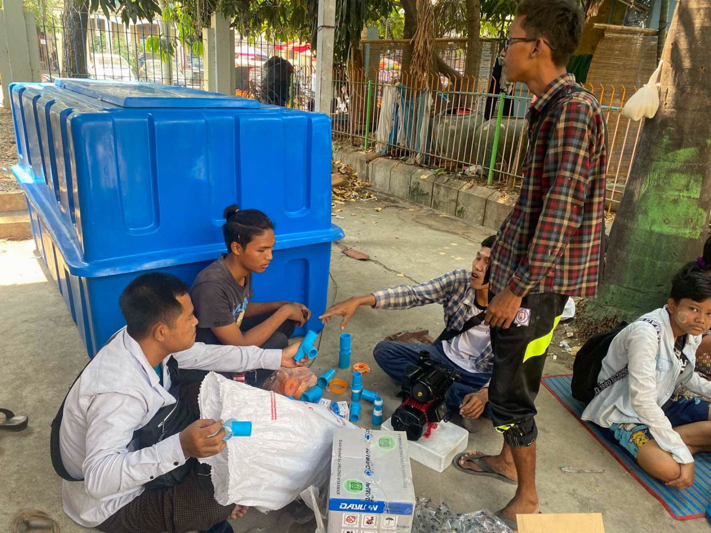 Une grande partie de l’équipe de MSF au Myanmar s’est rendue très rapidement sur place. Après 14 heures de route, elle a pu soutenir les soignants sur place. En ce moment, elle installe des réservoirs d’eau et des motopompes pour un centre de soins temporaire. Se déplacer reste très compliqué. Devant les pompes à essence, les queues sont longues.