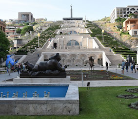 En cette agréable fin d’après-midi, il flotte sur la dynamique capitale un petit air de vacances, caractérisé par ses terrasses et ses parcs bien fréquentés, une ambiance jeune, décontractée, européanisée et pourtant particulière. Enseignes de marques, cafés, échoppes de fleurs, kiosques de boissons, glaces et en-cas... animent de larges avenues ombragées de platanes. La balade mène immanquablement à la place de la République, ou bat l’autre cœur d’Erevan. Autour de l’esplanade ovale aux nombreuses fontaines se dressent des bâtiments grandiloquents, dont le palais du gouvernement et un intéressant musée d’histoire. L’espace a été le théâtre des principales manifestations pacifiques ayant entraîné au printemps 2018, la démission de Serge Sarkissian (voir ci-dessous). Cette Révolution de velours a ravivé l’espoir d’un renouveau économique et social dans ce pays tourné vers l’avenir sans se départir de ses traditions. Un Etat qui mise aussi sur le développement de son secteur touristique...
