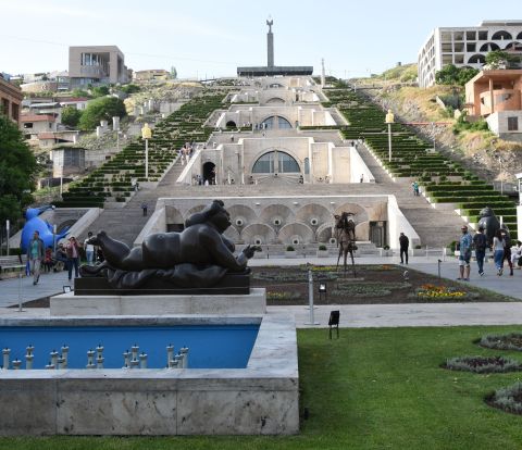 Si Paris a sa tour Eiffel, Athènes son Acropole ou encore Londres son Big Ben, impossible de dissocier Erevan de sa Cascade. Un monument emblématique de la capitale arménienne, composé de jardins en terrasses, de fontaines et de statues. Une imposante et singulière œuvre de béton en paliers d’une centaine de mètres de haut. Son ascension, à force de mollets ou en empruntant les escaliers roulants à l’intérieur de la construction, offre une vue panoramique de la cité. Un spectacle où le rose domine, principale couleur des façades en tuf d’Erevan, tranchant avec la sévérité de ses bâtiments hérités de la période soviétique. La capitale, forte de 1,2 million d’habitants – le tiers de la population d’Arménie – se niche au pied du mont Ararat couronné de neiges éternelles. Voilé de brume, le mythique massif se dérobera toutefois ce jour-là aux regards. Belvédère, la Cascade abrite dans ses murs une galerie d’art contemporain et, dans son parc attenant, plusieurs sculptures dont des œuvres tout en rondeur de Botero. La symbolique chute d’eau, point de ralliement des Erevanais, a été érigée vers 1970; et imaginée par l’architecte et urbaniste Alexandre Tamanian qui a conçu, au début des années 1920, les plans d’Erevan, lui donnant son visage néoclassique actuel.