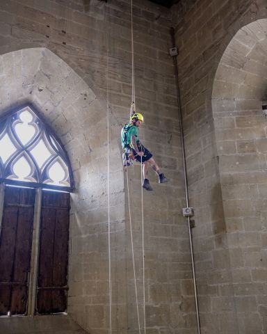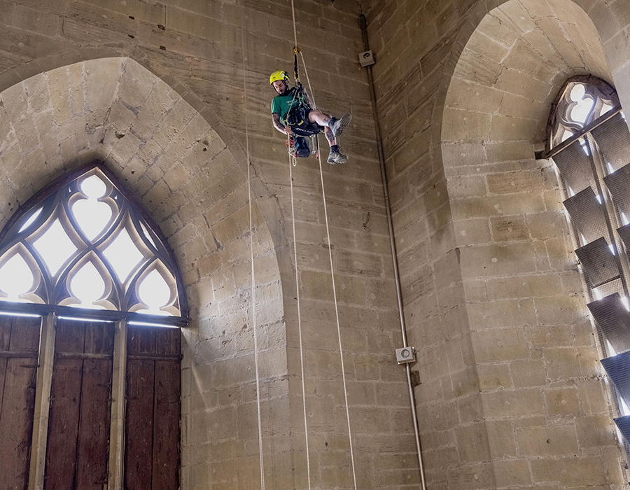Jordan Furlan et Maël Dubois s’équipent de leur casque et de leur harnais, muni d’une assise. «Un petit banc personnel bienvenu pour diminuer la charge dans le dos», expliquent-ils. Paré, le plus âgé entame l’ascension. Dans un mouvement de léger balancier équilibrant l’effort entre la force des bras et des jambes. Accompagné du cliquetis de mousquetons et autre matériel pendant à la ceinture. Avec une agilité éprouvée, il se hisse jusqu’au plafond, à plus de quinze mètres du sol. Et domine désormais son monde. «On se sent un peu comme un roi», lance-t-il, alors que résonnent les cloches de la cathédrale égrenant les heures. Du haut de son perchoir, l’acrobate montre des ancrages alentours qu’ils ont déjà examinés. «Nous nous sommes assurés de leur résistance à l’aide d’un testeur d’arrachement.» Resté au sol, Jordan Furlan ne lâche pas son collègue des yeux, prêt à intervenir au besoin. «Nous œuvrons toujours en binôme, question de sécurité. Nous installons systématiquement deux cordes, deux points d’accroche pour pallier un éventuel oubli, limiter les risques si on rencontre par exemple un angle coupant...» La sécurité dans le domaine, affirment les cordistes, va au-delà de celle pratiquée dans la construction. «On court moins de risques dans notre métier qu’en roulant tous les jours sur une autoroute.» La concentration reste aussi essentielle, même après des années de pratique.