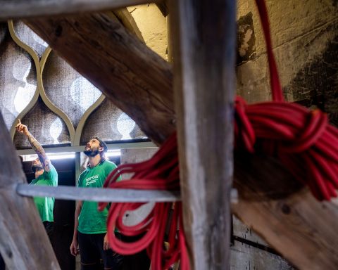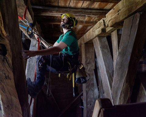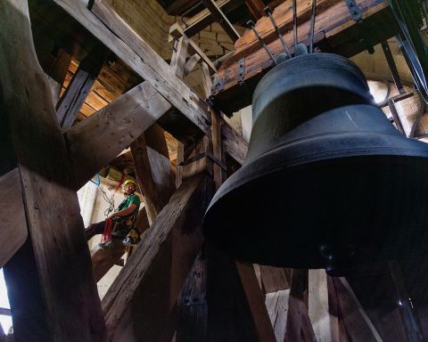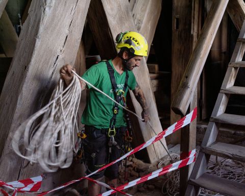 La démonstration de leur activité passera encore par l’accrochage de sangles potentiellement utilisées lors de déplacements dans les travaux en hauteur. Dans une chambre plus élevée où de magnifiques cloches dorment dans un écrin de charpente, Jordan Furlan joue à son tour l’homme-araignée, évoluant avec la même aisance que son homologue le long d’une poutre. Si le métier offre l’avantage d’opérer dans des environnements hors du commun, il ne peut s’exercer sans une bonne condition physique. «Je commence à ressentir le poids des ans. Je retournerai peut-être dans la menuiserie. Je n’imagine pas rester dans cette profession jusqu’à 50 ans», indique Maël Dubois. Jordan Furlan écarte, pour sa part, l’idée de renouer avec son travail premier de maçon. «Trop monotone. J’apprécie l’aspect technique du job actuel, la variété des chantiers, la nécessité de trouver des solutions pour accéder en toute sécurité aux lieux d’intervention. Un défi permanent. A terme, je pourrai me diriger vers la formation de cordistes.»