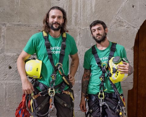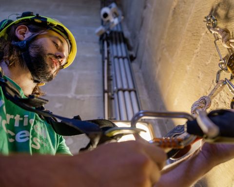 Rendez-vous au pied de la cathédrale de Fribourg, théâtre de l’intervention. Avec leur T-shirt vert émeraude imprimés d’un Vertical Access, du nom de l’entreprise qui les emploie, Jordan Furlan, 26 ans, et Maël Dubois, 38 ans, sont facilement identifiables. Les présentations effectuées, un rapide café à une terrasse voisine permet de s’informer sur la nature du travail des deux cordistes et leur trajectoire professionnelle. Au terme de ce premier défrichage, les ouvriers acrobates nous invitent à les suivre dans l’imposant édifice gothique. Le duo gravit d’un pas alerte le sombre et étroit escalier en colimaçon menant au faîte de la tour. Et s’arrête avant d’atteindre le sommet, au deuxième étage. Trousseau de clefs en main, Maël Dubois déverrouille une porte latérale, ouvrant sur une salle inaccessible au public. Une pièce dans les combles où deux cordes pendent mollement dans le vide. «Nous avons démarré le travail hier. Nous vérifions les points d’ancrage fixés dans les murs, permettant notamment de procéder au contrôle des gaines électriques. Une surveillance qui doit se faire chaque année.»