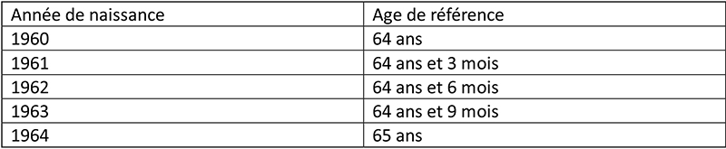 L’âge de départ à la retraite des femmes est désormais calé sur celui des hommes, soit 65 ans. Cet âge sert de valeur de référence à tout le monde pour l’anticipation ou l’ajournement de la retraite.