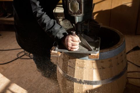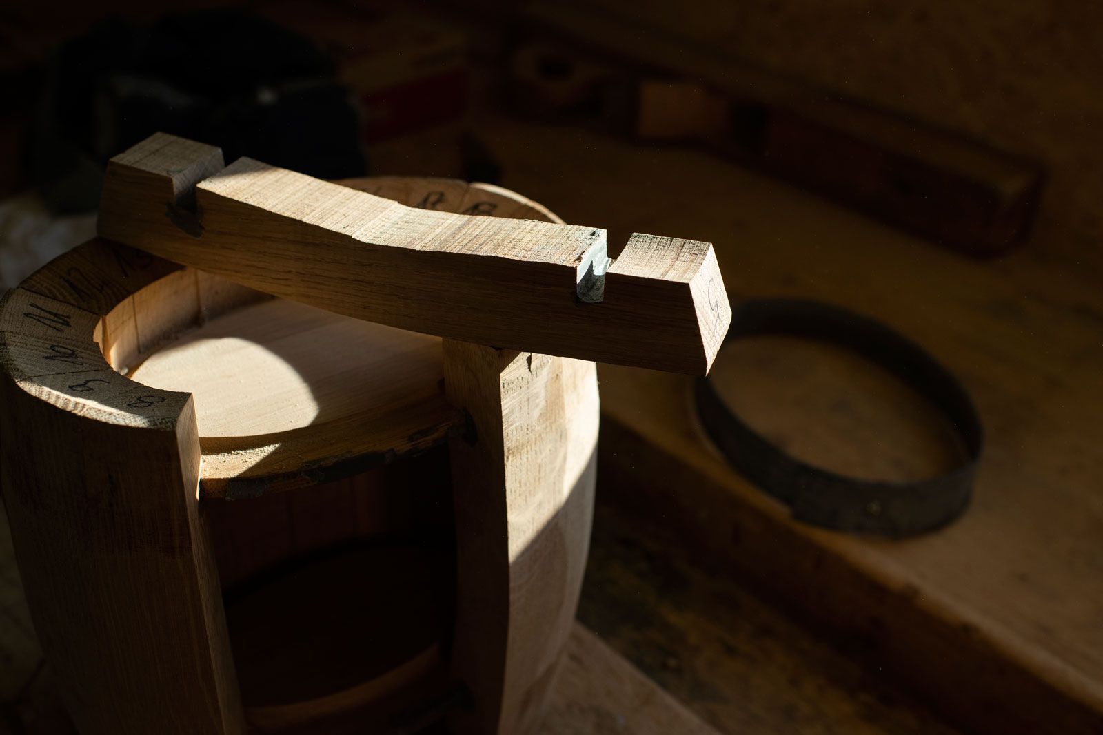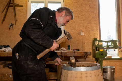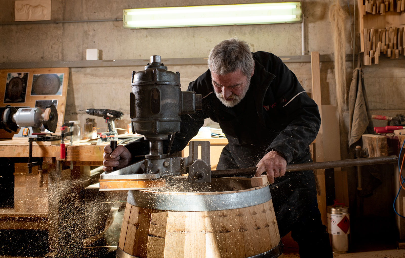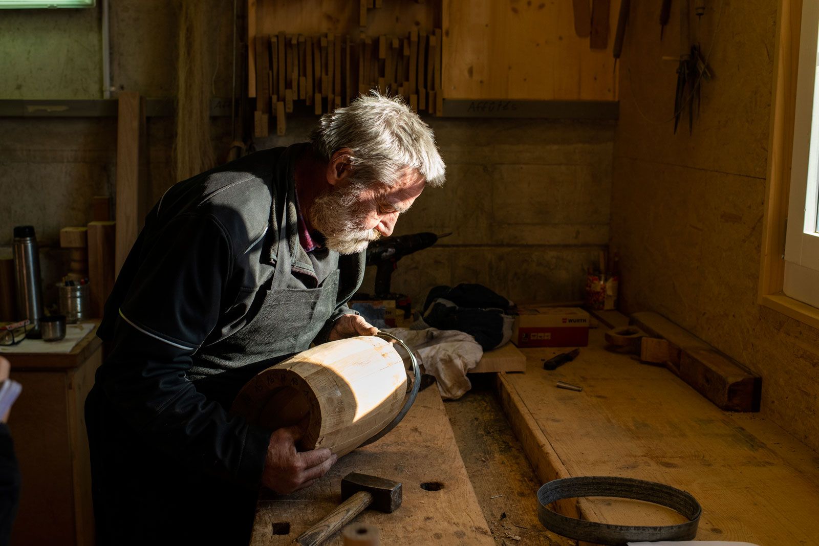 L'artisan tonnelier, Franz Hüsler, au travail.