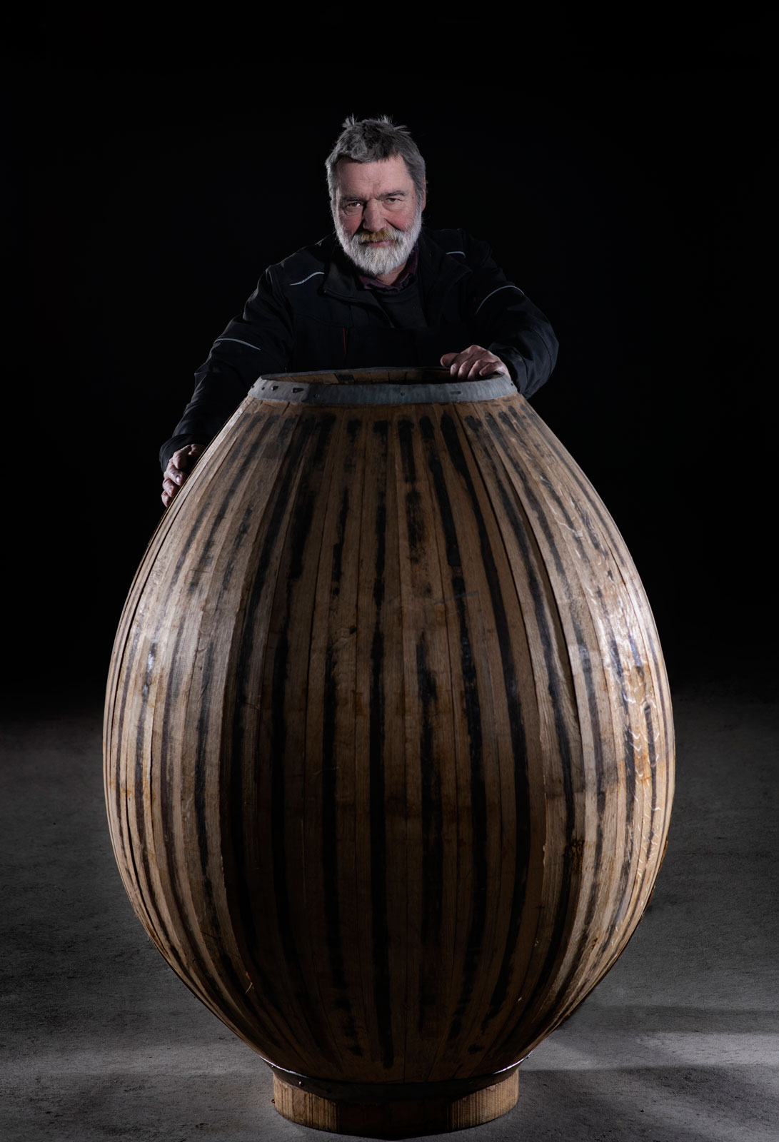 Franz Hüsler et son tonneau en forme d’œuf d’une capacité de 500 litres: «C’est une première mondiale. Une construction incroyable, très complexe. Mais je ne dirai ni comment j’ai procédé, ni le nombre d’heures passées. Secrets de fabrication.»