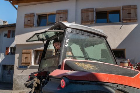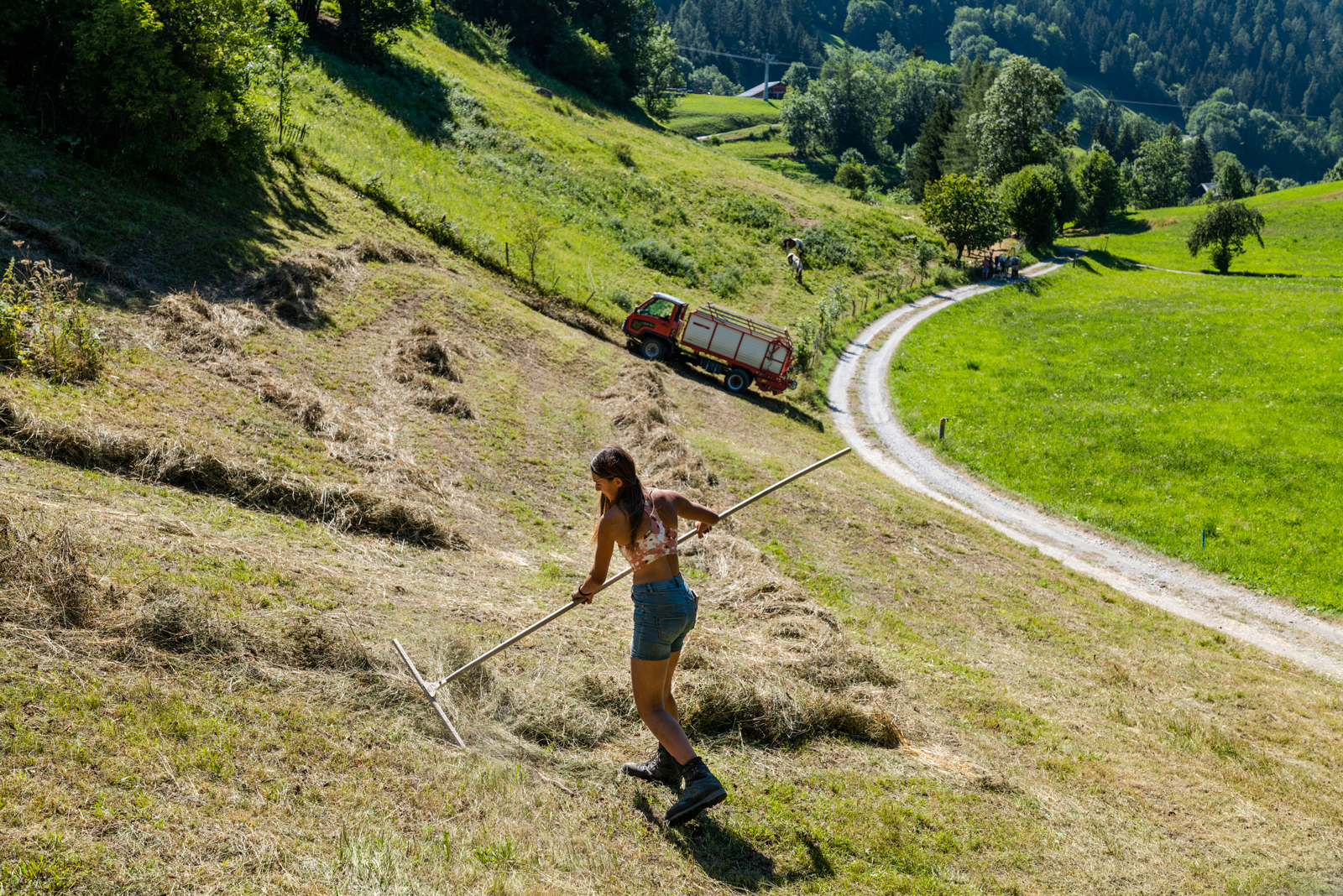 Un modeste tracteur face à une pente vertigineuse. «Peut-être que la demoiselle veut m’accompagner», s’exclame le paysan, Yves Bruchez, en arrivant au bas du versant. Défi relevé. Accroché à la colline, l’engin grimpe, dessinant encore et encore des zigzags sur le terrain. Les bandes de foin, appelées andins, sont récoltées à l’arrière de la machine. Tout en manœuvrant, le Valaisan décrit les étapes précédant la récolte. Mais arrivés au sommet de la crête, le silence se fait. Toute la vallée du Châble s’offre à perte de vue. En face, on distingue Verbier et plusieurs alpages dont celui d’Yves Bruchez. Plus loin, broutent quelques moutons et des vaches de combat comme celles dont s’occupe l’agriculteur. Soudain, l’homme s’élance dans la descente. Le tracteur s’agrippe, résistant à la forte déclivité. A l’intérieur, on est obligé de se retenir à la poignée de la porte pour ne pas basculer vers l’avant. Yves Bruchez sourit tout en maintenant fermement le volant. L’agriculture, c’est son rêve de gosse, raconte-il avec un accent prononcé avant d’atteindre le bas de la pente. Encore secoué en sortant du véhicule, on titube un peu. Une chose est sûre, l’expérience concurrence largement les montagnes russes. Jiyana Tassin