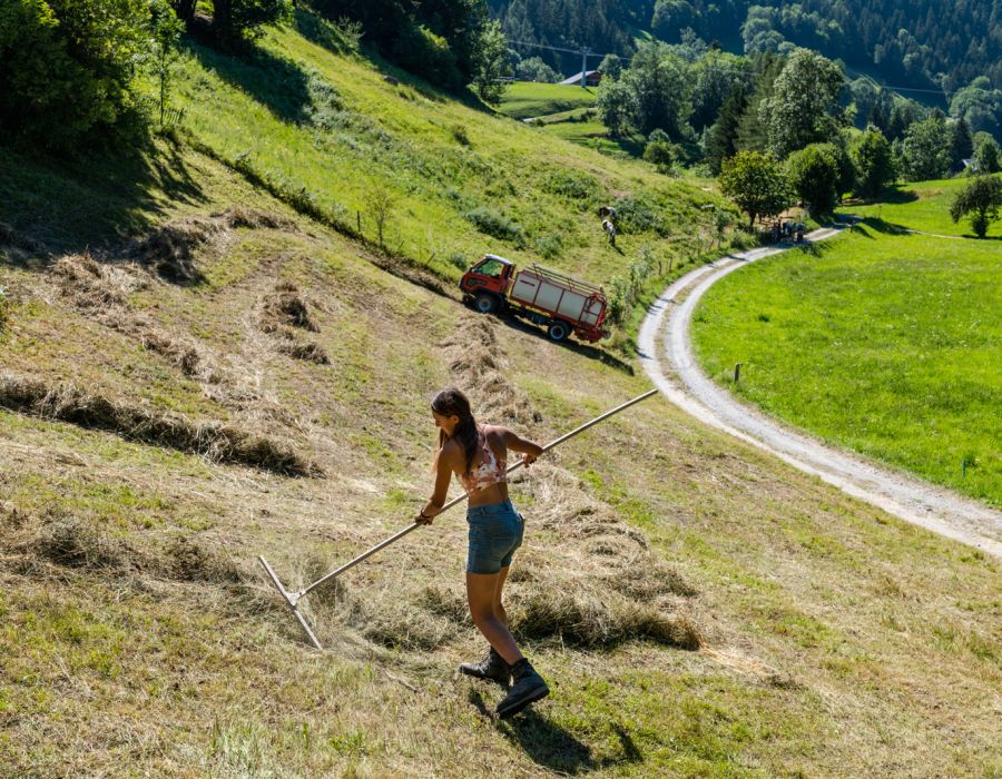 Charlène Taramarcaz au travail, rateau à la main au milieu d'un champ.