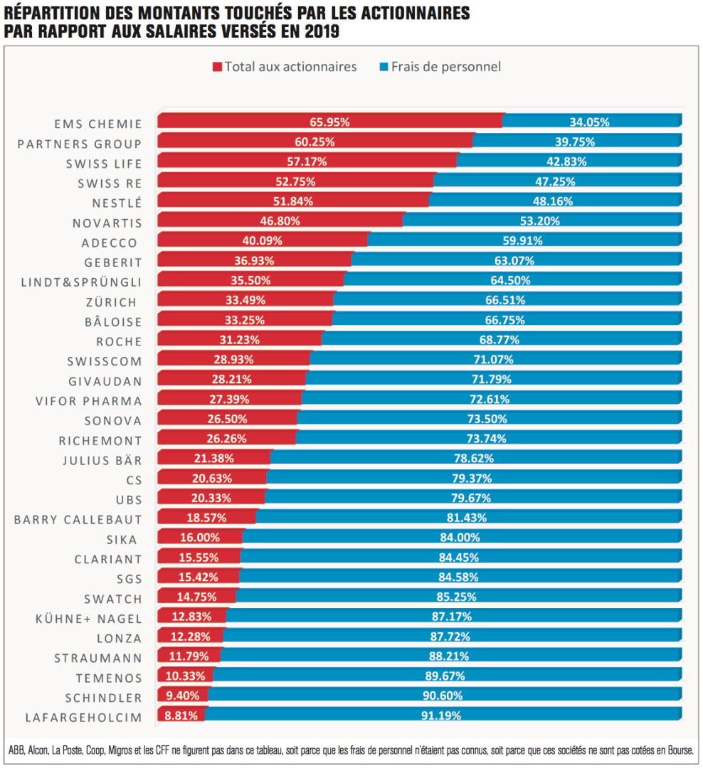 L’écart se creuse aussi en matière de redistribution du travail vers le capital. Ainsi, «une grande partie de la valeur ajoutée générée par le 1,6 million d’employés des 37 groupes étudiés est transmise aux actionnaires», souligne Unia, indiquant qu’en moyenne, 67% de la valeur ajoutée totale est allée aux travailleurs pour le paiement des salaires et 33% dans les poches des actionnaires. A contrario, cinq de ces sociétés, EMS-Chemie, Partners Group, Swiss Life, Swiss Re et Nestlé (voir graphique ci-dessous) reversent davantage à leurs actionnaires qu’à leurs salariés. La palme revient à l’entreprise de la famille Blocher, qui redistribue 65,95% du produit du travail à ses actionnaires (462 millions), les frais salariaux ne représentant que les 34,05% (239 millions). Ainsi, sur une journée de 9 heures, un ouvrier d’EMS-Chemie travaille 3 heures pour payer son salaire et 6 heures pour engraisser les actionnaires, dont les trois filles du patriarche qui se sont partagé 326 millions…