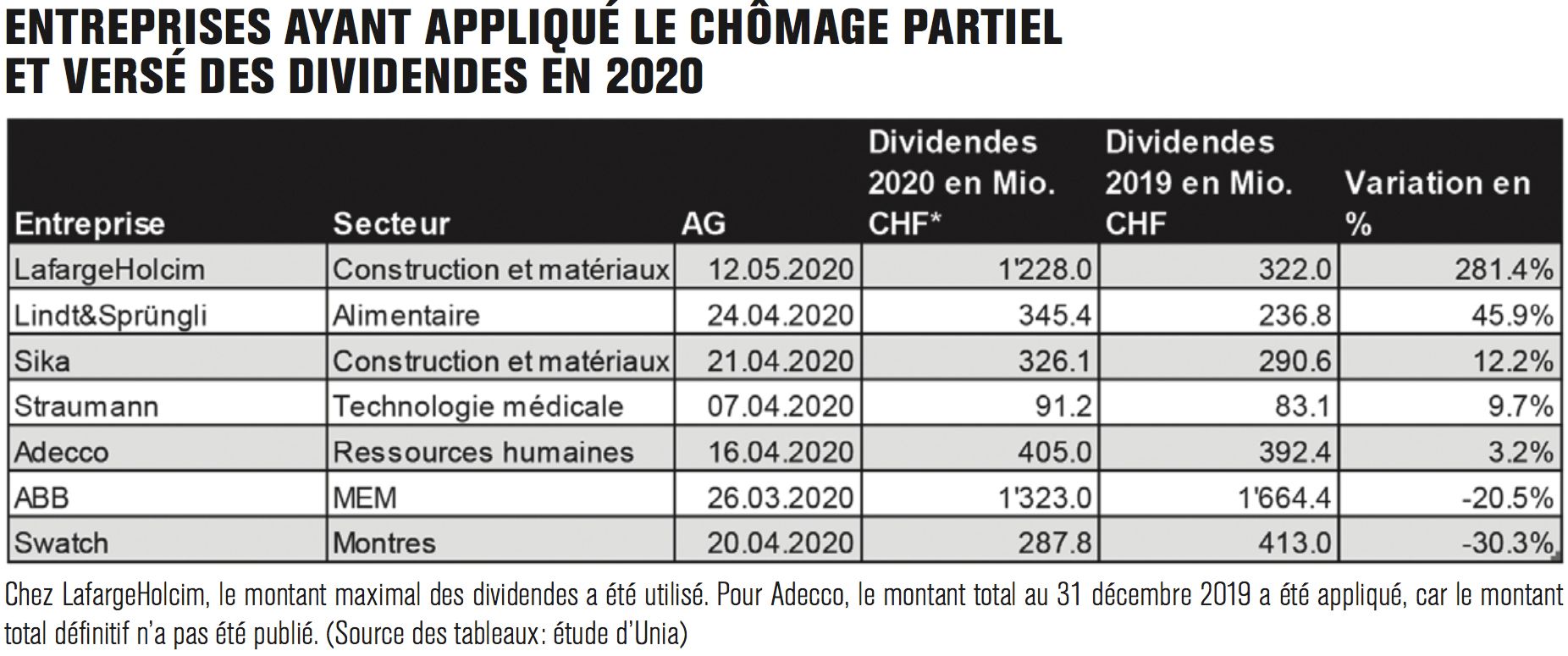 Ainsi, sept entreprises ayant fait appel à l’aide du chômage partiel en raison du coronavirus ont approuvé, durant leurs assemblées générales tenues entre le 26 mars pour la première et le 12 mai pour la dernière, le versement de millions de francs à leurs actionnaires. Au total, près de 4 milliards. Il s’agit de LafargeHolcim, Lindt & Sprüngli, Sika, Straumann, Adecco, ABB et Swatch. Pour les cinq premières, le montant des dividendes a même augmenté par rapport à 2019. Et comble du cynisme, l’entreprise Straumann, active dans la technologie médicale, a non seulement versé plus de 91 millions à ses actionnaires, soit une hausse de 9,7% par rapport à 2019, mais a annoncé dans la foulée que 660 personnes allaient être licenciées dans le monde d’ici à la fin de l’année, dont une soixantaine à Bâle…