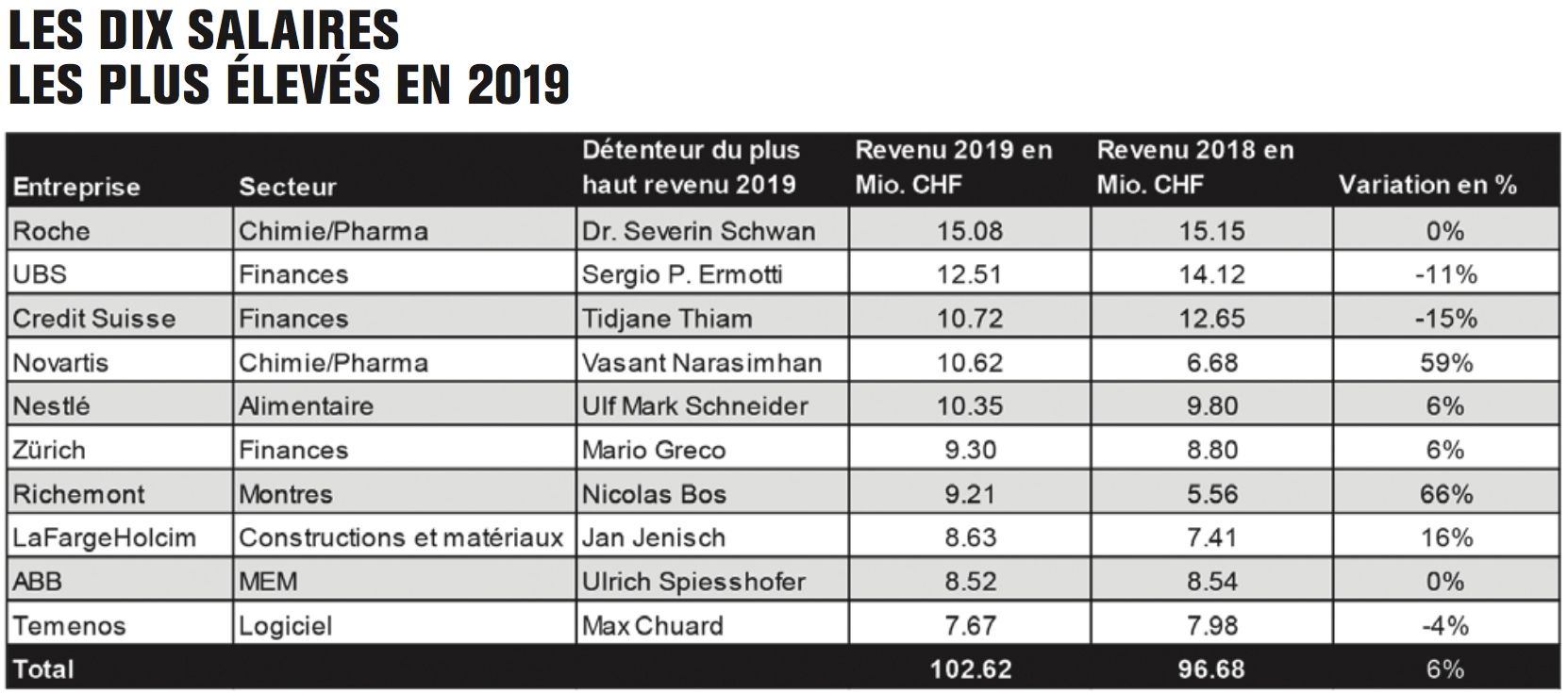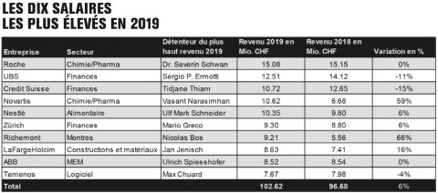 L’étude d’Unia constate également un accroissement du fossé entre bas salaire et salaire des top managers dans les 37 entreprises analysées. Cet écart s’est creusé passant de 1 à 142 en 2018 à 1 à 148 en 2019. C’est-à-dire que le plus haut salaire versé dans une société représente en moyenne 148 fois le salaire le plus bas. L’écart le plus important est celui existant chez Roche: le CEO de l’entreprise pharmaceutique, Severin Schwan, gagne 308 fois plus que l’ouvrier le moins bien payé et affiche un salaire de 15,1 millions de francs annuel. Un salarié touchant 3800 francs par mois devrait ainsi travailler 308 ans pour obtenir cette somme. Et un autre avec un salaire de 5000 francs devrait s’y atteler durant 232 années…