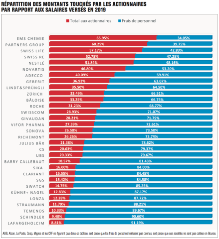 Du côté des profits réalisés en 2019, les 33 sociétés cotées en Bourse étudiées ont, à elles seules, versé aux actionnaires une somme totale de 63 milliards de francs sous forme de dividendes et de rachat d’actions, soit 4,4 milliards de plus qu’en 2018. Un montant total à mettre en regard avec les dépenses annuelles de la Confédération qui se sont élevées à 71 milliards l’an passé.