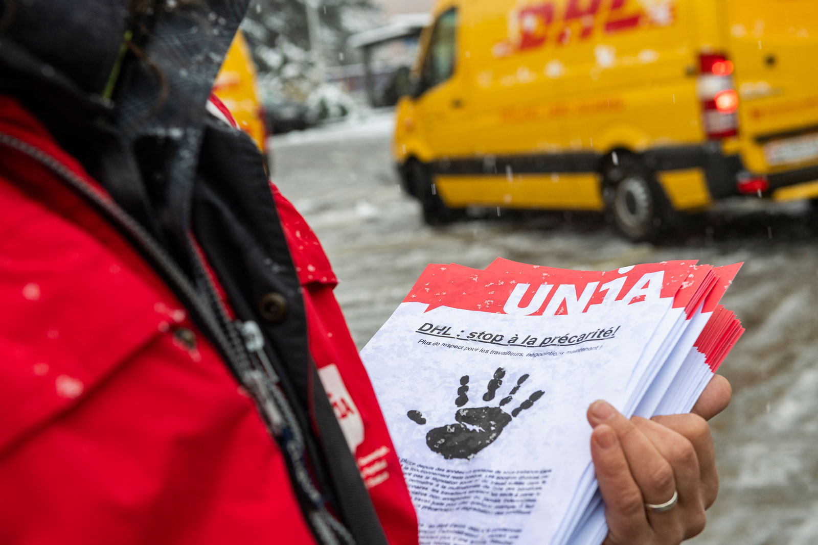 Distribution de tracts sur lesquels on peut lire: "DHL: stop à la précarité"