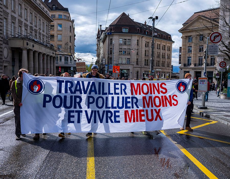 Bien que passant encore trop souvent au second plan, les questions climatiques, et notamment la baisse du temps de travail, trouvent davantage leur place dans les comités d’entreprises et les revendications. Photo: manifestation de la Grève pour l’avenir à Lausanne, avril 2022.