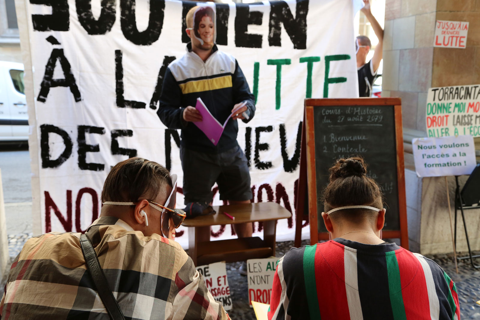 A deux pas du Département de l’instruction publique, une salle de cours en plein air prend place. Tableau noir, chaises et professeur masqué à l’effigie de la conseillère d’Etat en charge de l’Instruction publique, de la formation et de la jeunesse. Celui-ci fait l’appel: «L’ATS présent? Oui! Léman Bleu? Oui! Le Courrier? Présent! Madame Emery-Torracinta? Elle est en vacances M’sieur!» Une conférence de presse pas tout à fait comme les autres menée par le «Collectif Lutte des MNA» (mineurs non accompagnés) en ce 30 juillet sous forme de cours d’histoire virtuel (après un saut de 60 ans dans le futur) sur «le scandale des années 2010» quand le globe terrestre était encore sujet aux migrations de tous les dangers.