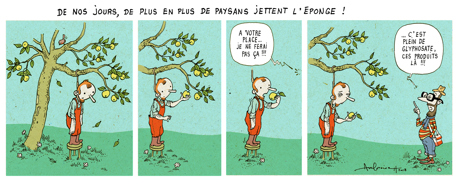 un paysan veut se suicider à un pommier. La corde au cou, il cueille une pomme. Un écolo bobo vient à passer par là et lui dit "A votre place... je ne ferais pas ça!!! C'est plein de glyphosate,..."