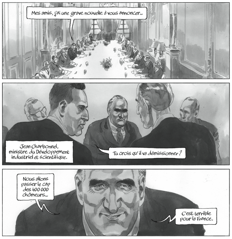 Finalement, le chômage est-il un choix? Est-ce une conséquence inassumée publiquement de l’application de mesures néolibérales? Les auteurs ont retrouvé un document d’archives daté de 1987 provenant de la banque JP Morgan. Le nombre de chômeurs français y est décrit comme élevé. Cette réalité est considérée positivement par les rédacteurs du rapport. Ainsi que ces derniers le notent, elle permet d’alléger la pression visant à l’augmentation des revenus du travail. En 2019, Pierre-Edouard Magnan, porte-parole du Mouvement national des chômeurs et des précaires, constate que le rapport de force avec les employeurs et les actionnaires différerait en situation de plein-emploi. De la sorte, assiste-t-on à une forme de gouvernement par la peur du chômage en vue de réduire les revendications salariales? Bien que le fait de se retrouver en dehors du marché du travail engendre au moins 10000 décès (suicides, maladies…) chaque année en France, cela semble être pris en compte par les zélateurs du libéralisme économique comme un paramètre secondaire. Le lecteur se fera sa propre opinion sur ces questions en lisant cette bande dessinée, dans laquelle le peuple apparaît peu. Ainsi, la dépossession du politique en matière économique implique également la mise à l’écart des classes populaires. Jusqu’à quand cette situation pourra-t-elle perdurer? Telle semble être l’ultime question que l’on peut se poser en refermant cet ouvrage.