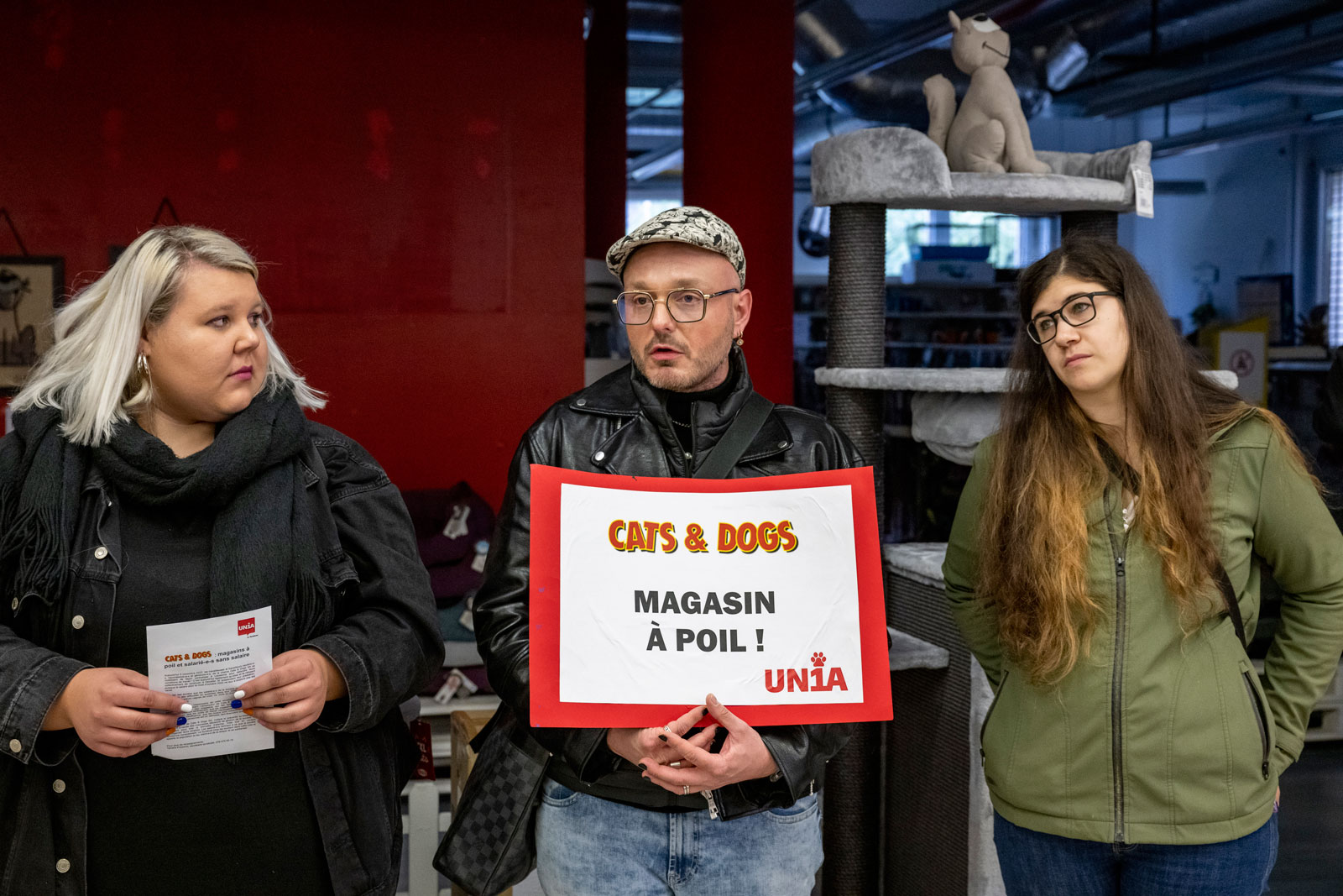 Des employés de Cats & Dogs ont sorti les griffes samedi passé devant une succursale de la chaîne, à Lausanne. Raison de leur colère: des rémunérations qui n’avaient toujours pas été versées en dépit des promesses du patron. «L’employeur avait garanti qu’ils recevraient leur salaire d’octobre d’ici au 4 novembre au plus tard. Mais une partie du personnel, soit environ 25 personnes sur les quelque 35 actives au sein des Cats & Dogs ouverts dans les cantons de Vaud, Neuchâtel et Genève n’ont toujours pas été payées», précise Giorgio Mancuso, secrétaire syndical d’Unia. Dans ce contexte, avec le soutien du syndicat, ils étaient une quinzaine à protester devant la boutique lausannoise gardée fermée. Stores également tirés dans sept autres magasins de l’enseigne, soit plus de la moitié que compte la chaîne en Suisse romande. «Il ne s’agit pas d’un débrayage ou d’une grève mais d’une suspension d’activité comme l’autorise le Code des obligations dans ce cas de figure», poursuit le syndicaliste notant que le travail reprendra dès que les salariés toucheront leur dû. D’ailleurs, un certain nombre d’entre eux se trouvaient à leur poste ayant reçu une partie ou la totalité de leur paye.