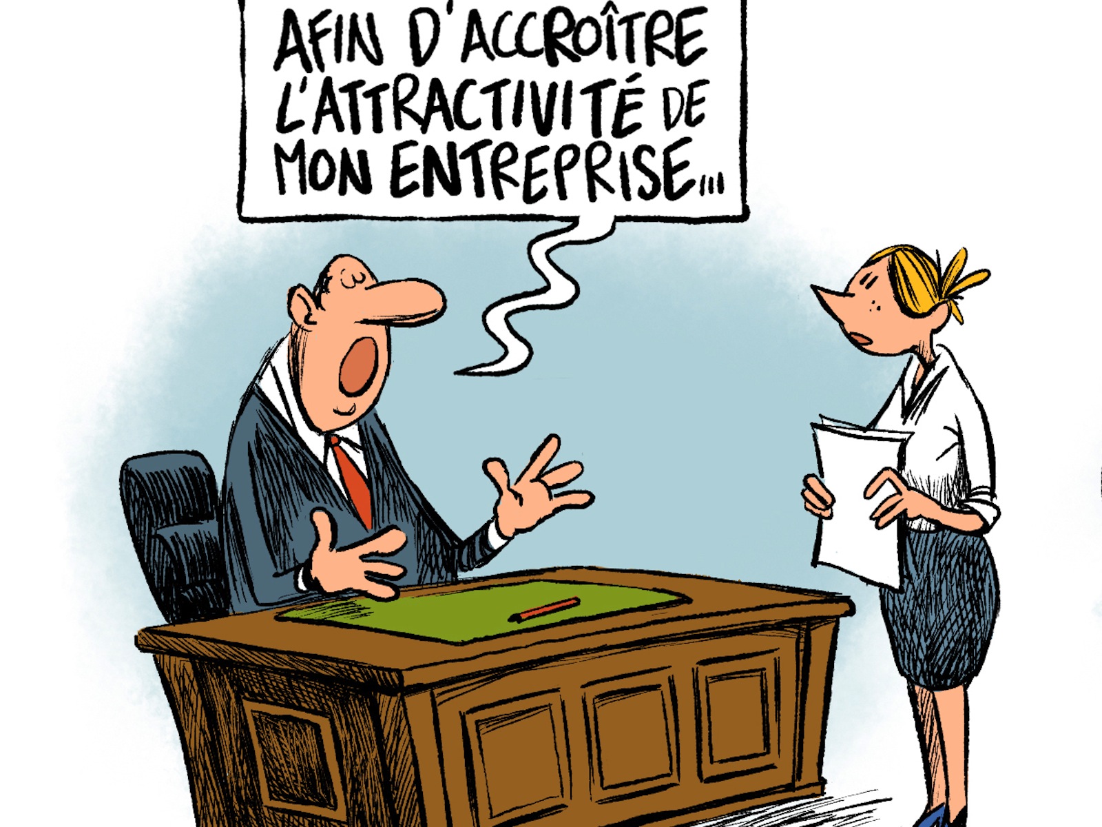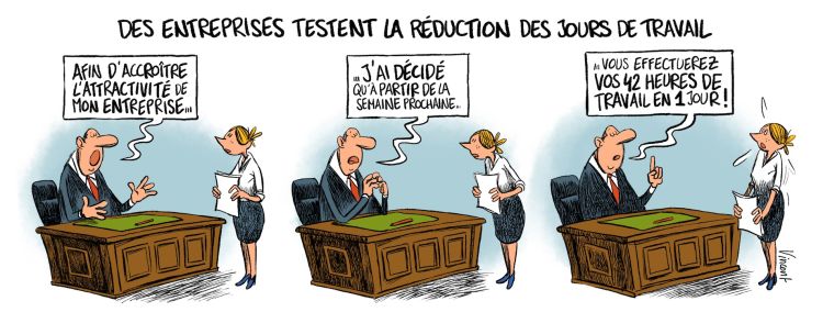 Un patron s'adresse à sa collaboratrice: Afin d'accroître l'attractivité de mon entreprise, j'ai décidé qu'à partir de la semaine prochaine vous effectuerez vos 42 heures de travail en 1 jour!